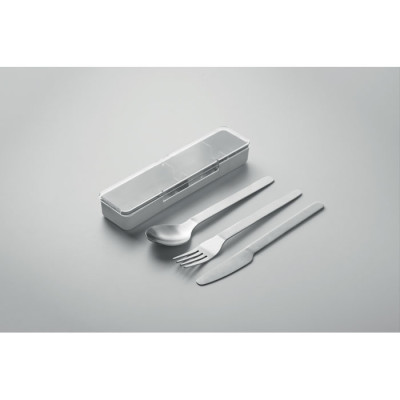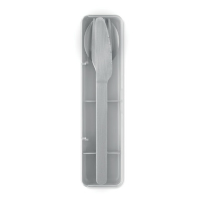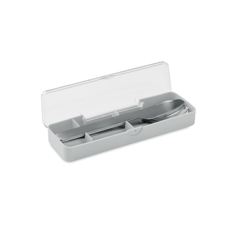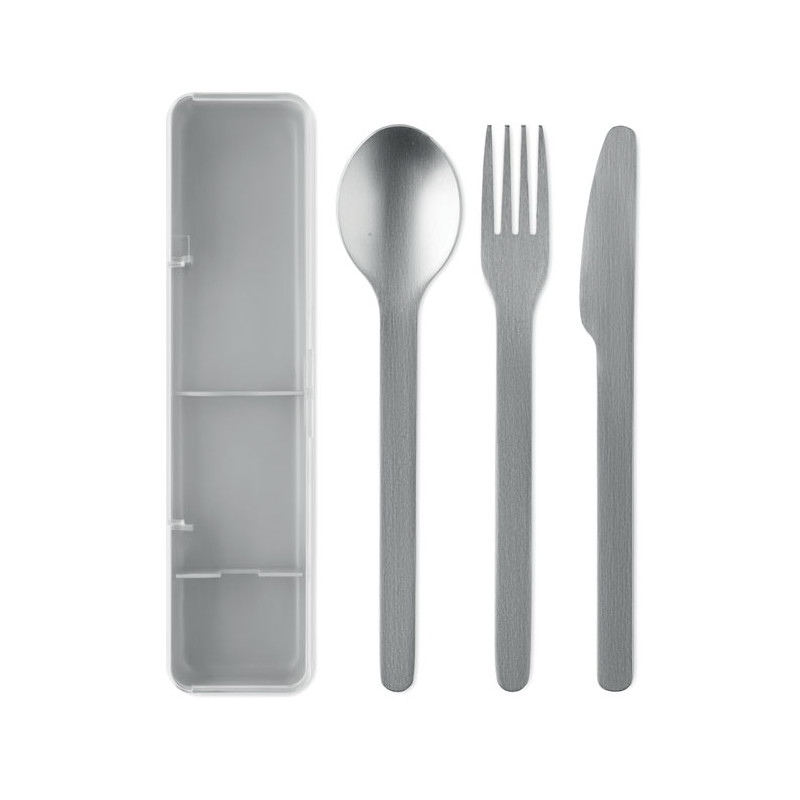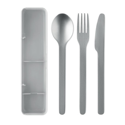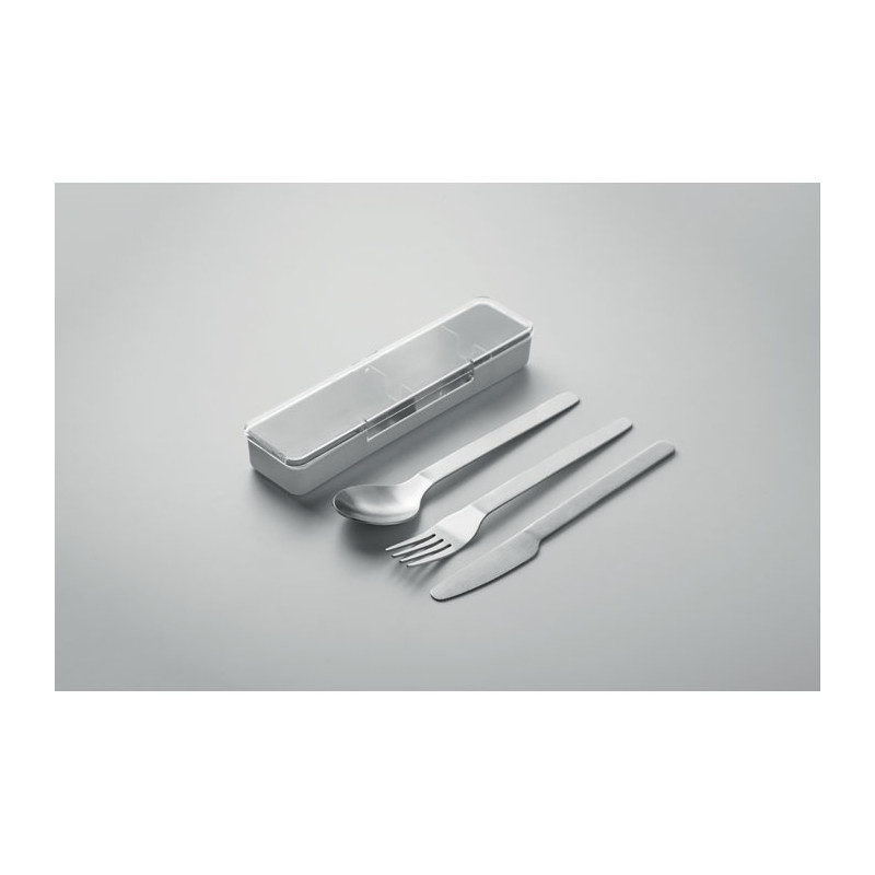 Set de cubiertos de acero inoxidable con estuche de PP. Este juego incluye un tenedor, un cuchillo y una cuchara.