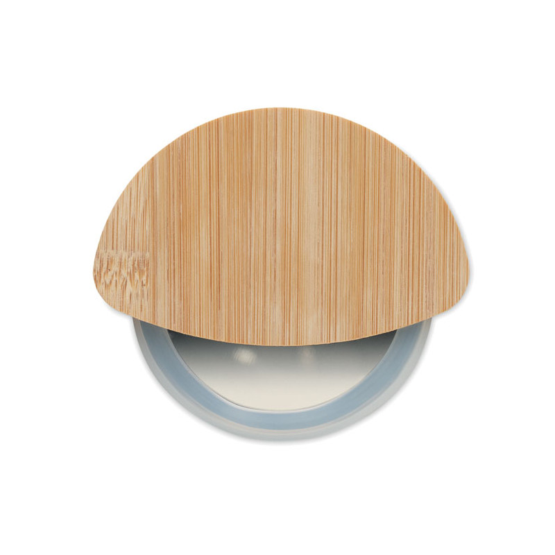 Cortador de pizza redondo con mango de bambú y cuchilla de acero inoxidable. Con anillo protector de silicona blanca transparente.