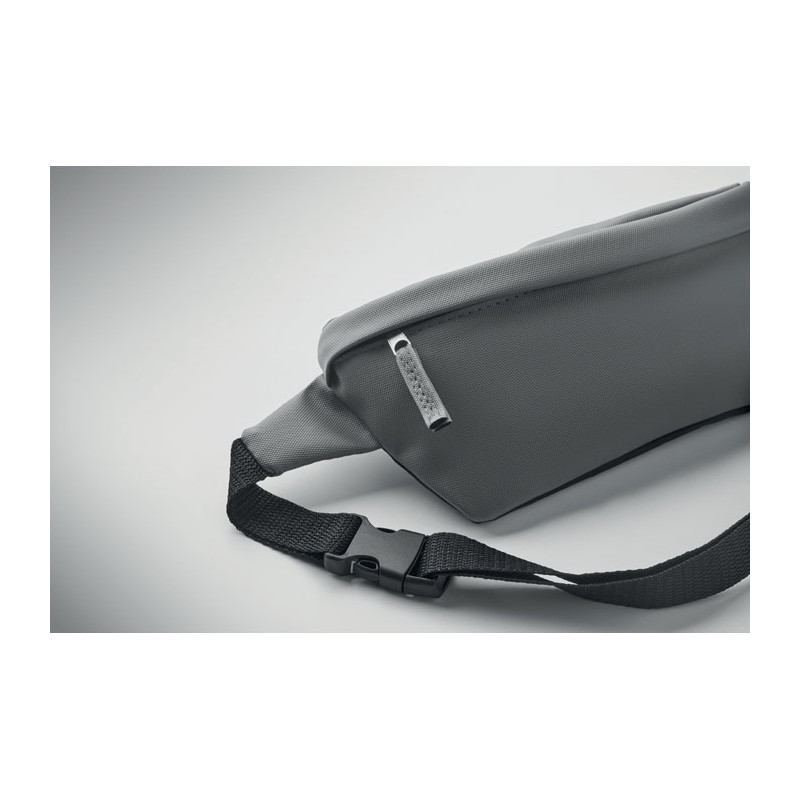 Riñonerade poliéster 600D RPET recubierto de PU, forro de poliéster 210D RPET y bolsillo frontal con cremallera.