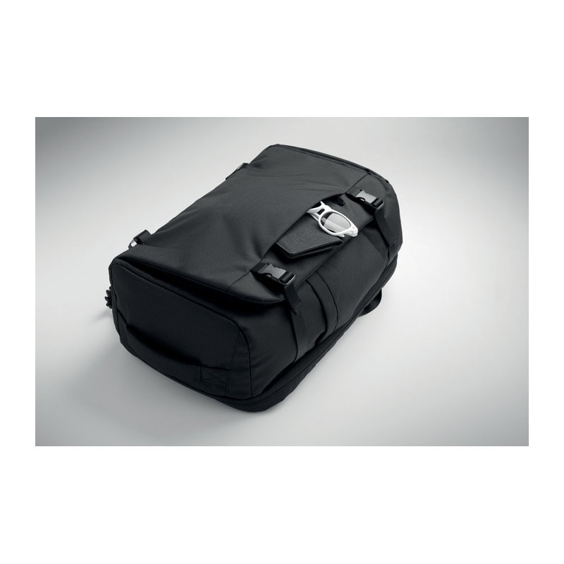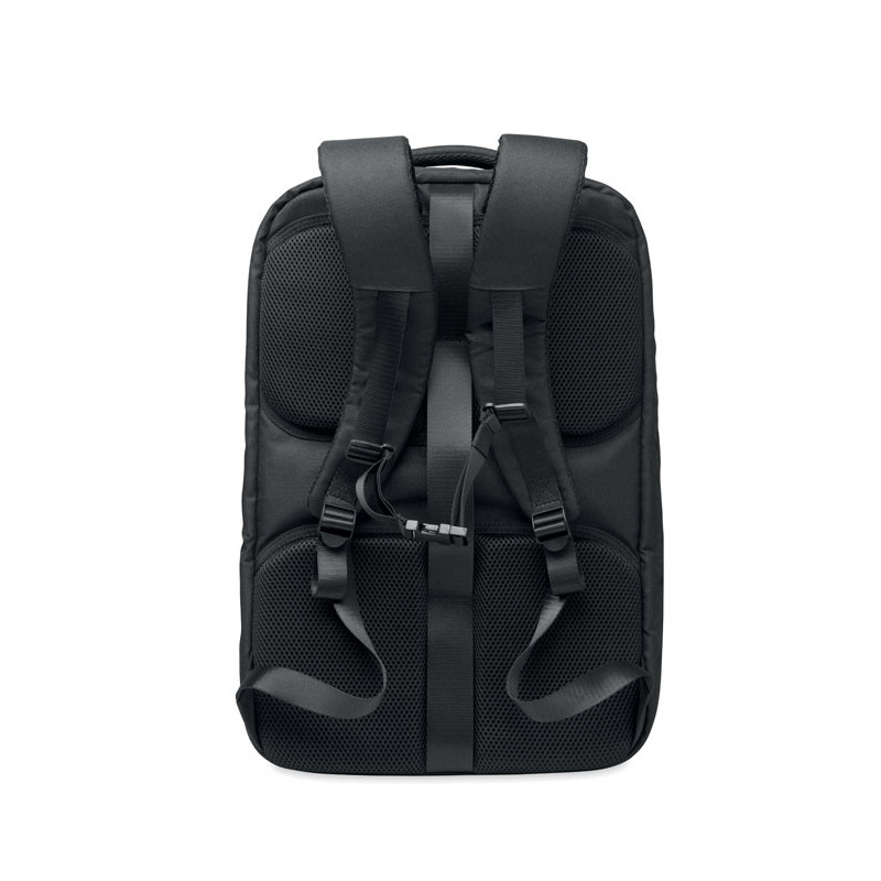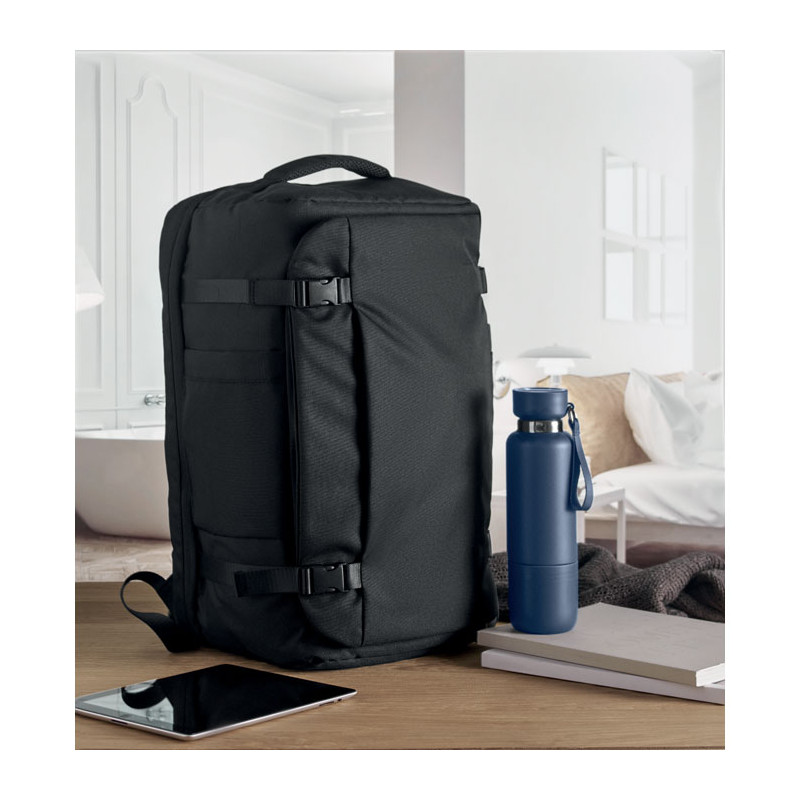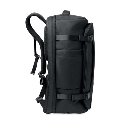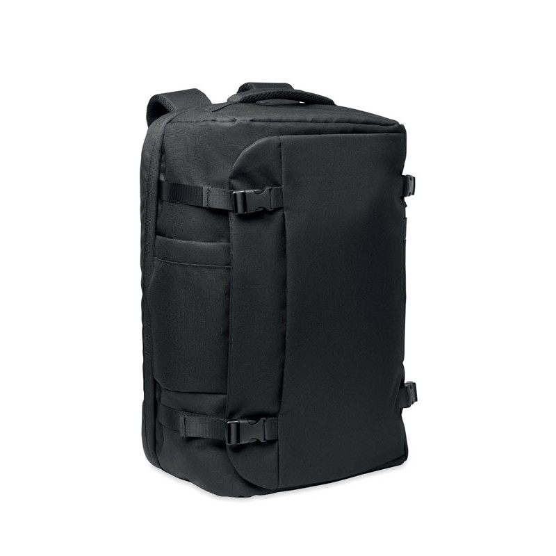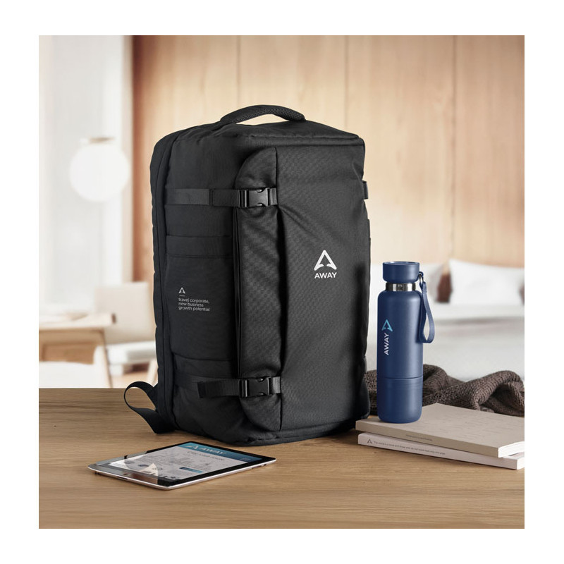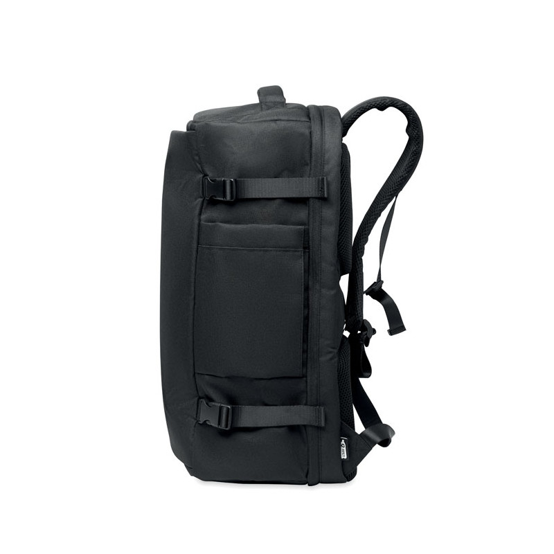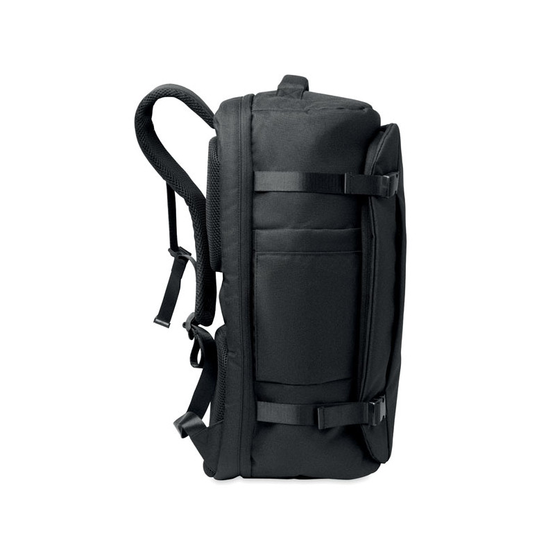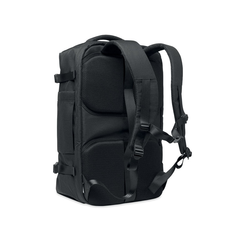 Mochila grande de viaje para portátil de 17'' en poliéster RPET 600D. Cuenta con varios compartimentos como uno principal para la ropa, dos acolchados para el portátil y la tableta y más. Panel trasero acolchado, correa para el hombro y asa de mano.