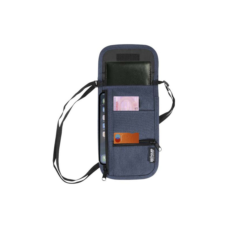 La bolsa de viaje "Ross" está fabricada en materiales reciclados con certificado GRS y diseñada para mantener los artículos esenciales seguros y accesibles en cualquier lugar. Compacta y práctica, cuenta con múltiples bolsillos para teléfono, batería externa, pasaporte, tarjetas, monedas, cables y mucho más. Una correa ajustable de hasta 130 cm permite llevarla cómodamente, lo que la convierte en el accesorio de viaje ideal para las aventuras modernas.