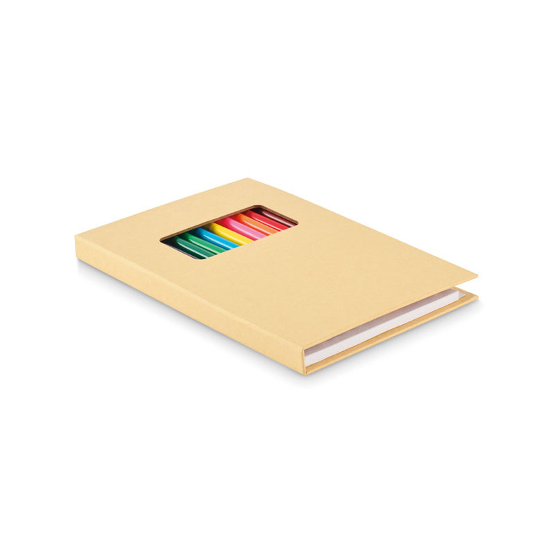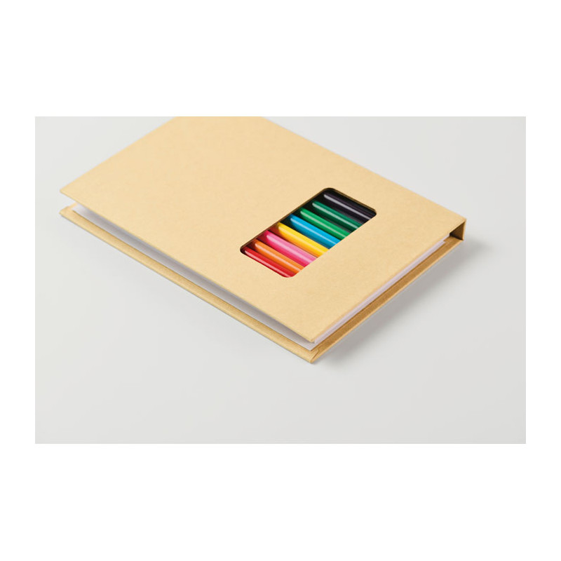 Set de dibujo infantil con 50 hojas de papel reciclado y 12 lápices de colores de madera. Con cubierta de papel kraft.
