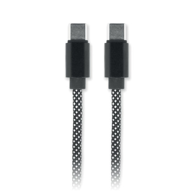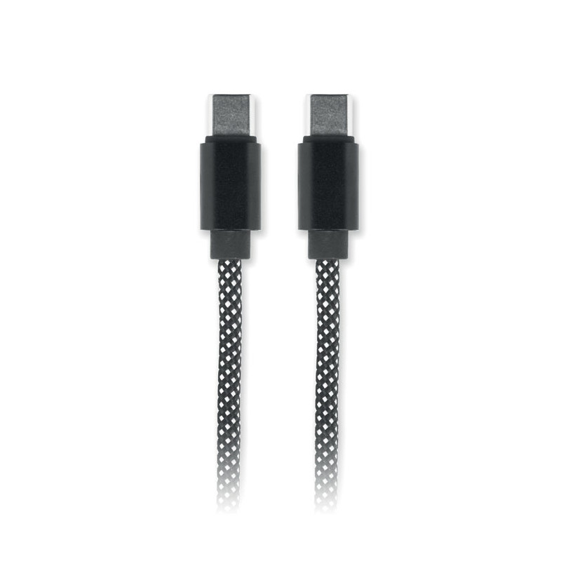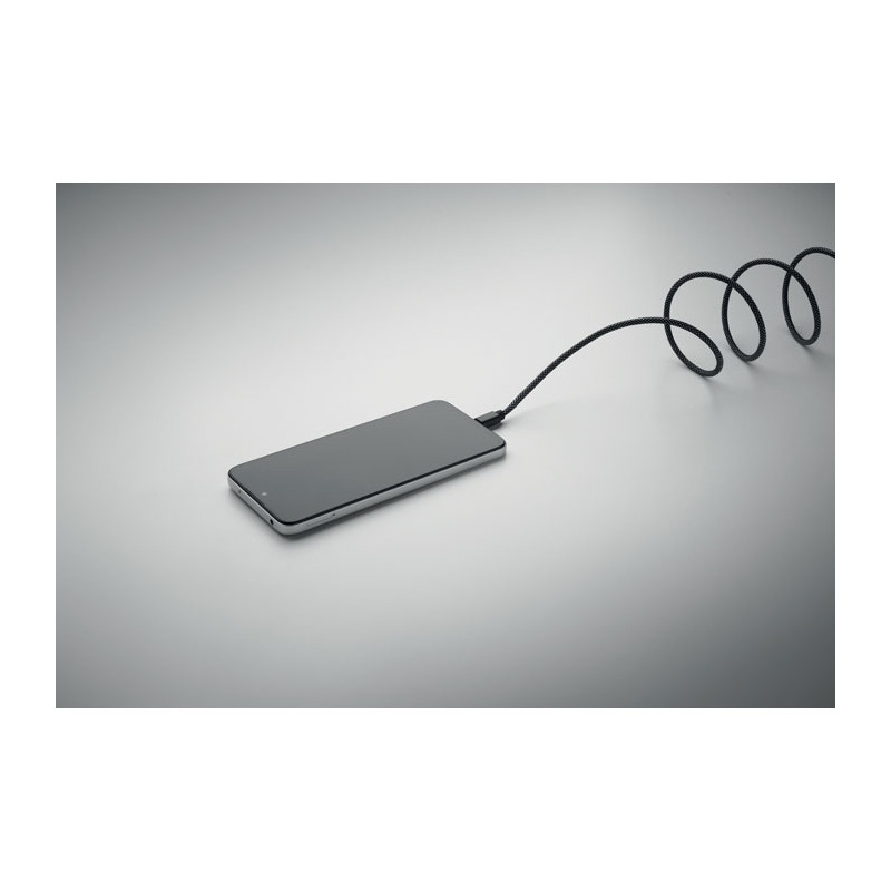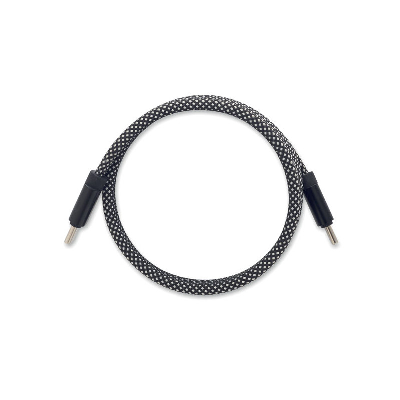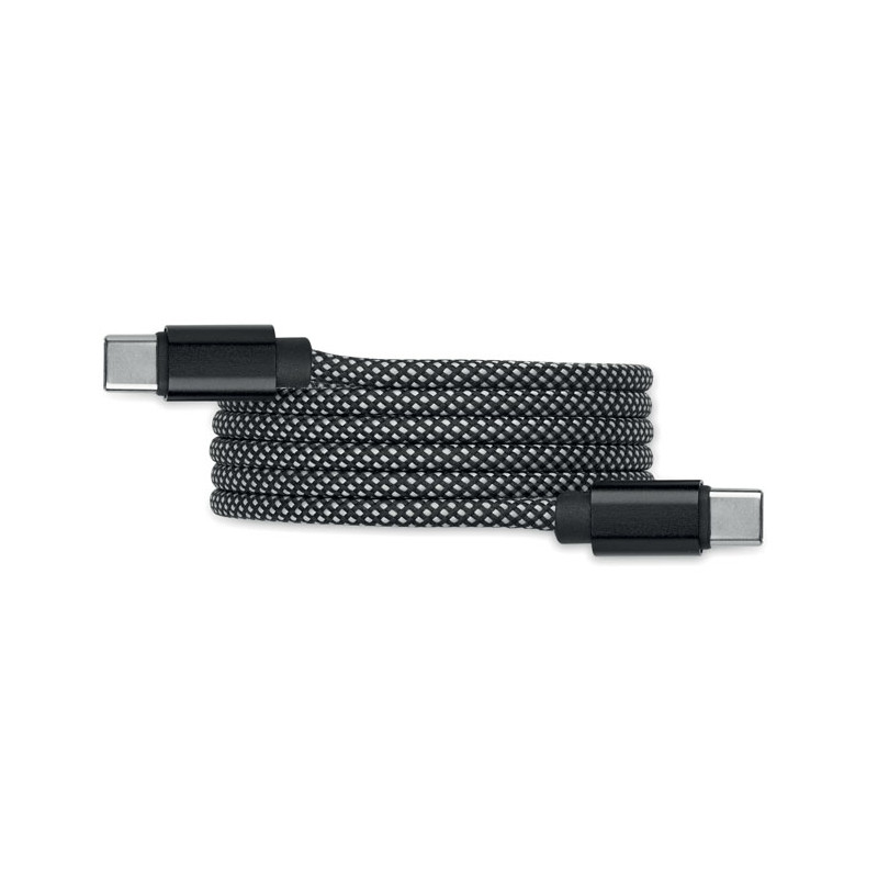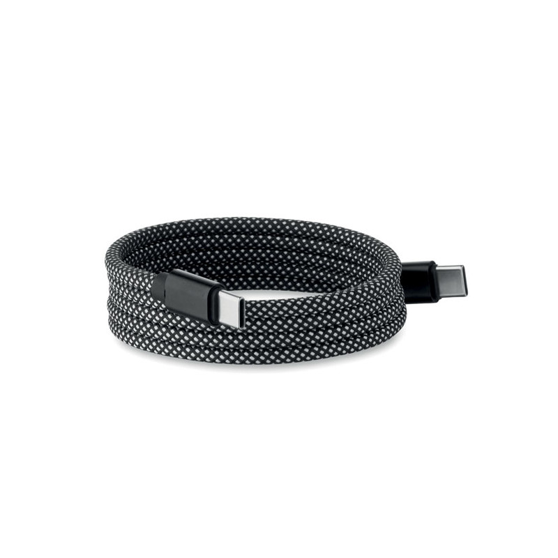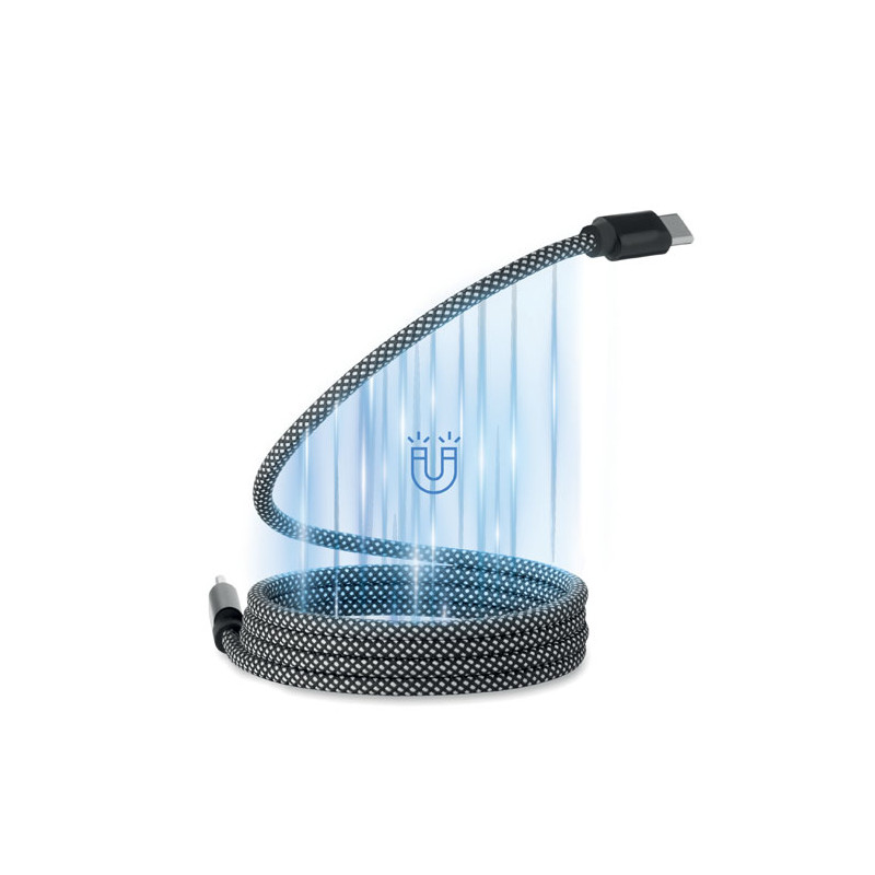 Cable magnético trenzado sin enredos fabricado en RPET con certificación GRS y aluminio. Tipo C a C, carga rápida de 60 W, 1 m de longitud. Se apila siempre de forma ordenada y nunca se anuda.