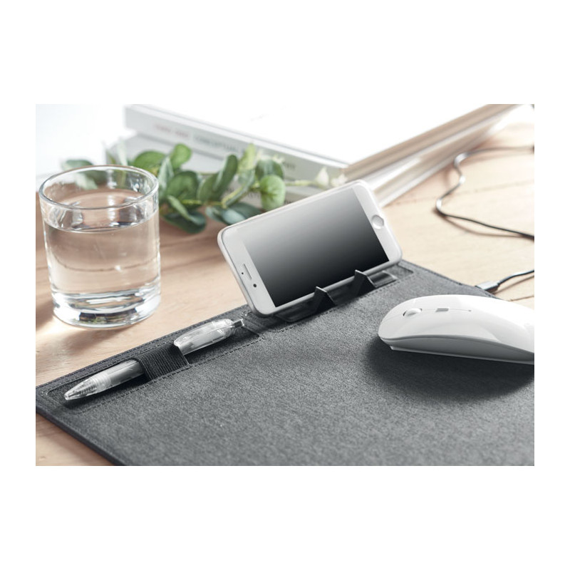 Alfombrilla de ratón multifuncional de RPET jaspeado 300D con cargador inalámbrico de 15 W y soporte para el teléfono. Salida: DC 9V/1.6A (15W)para una carga rápida. Compatible con los últimos Android, iPhone® 8 y más recientes.