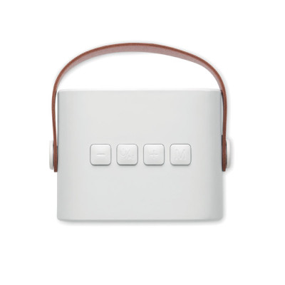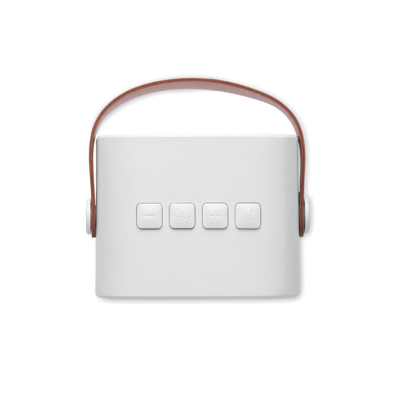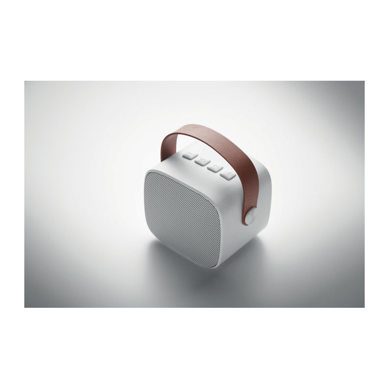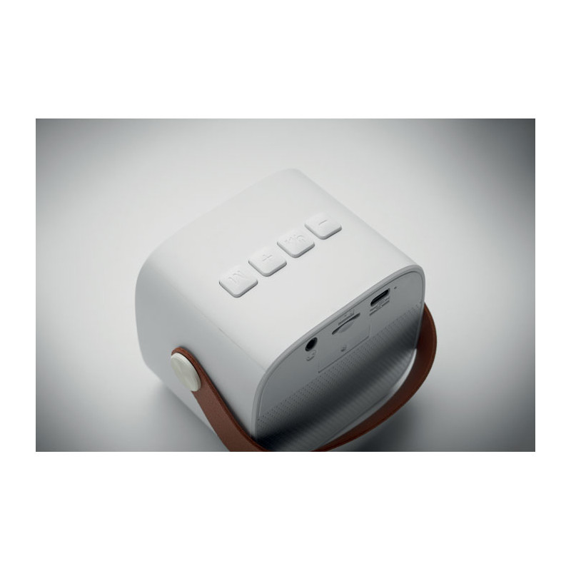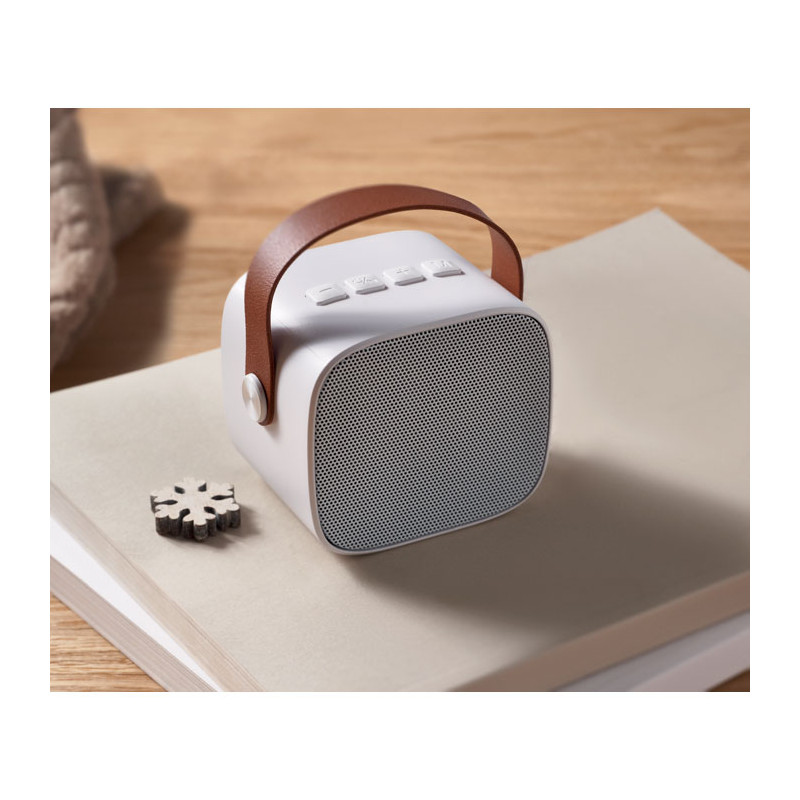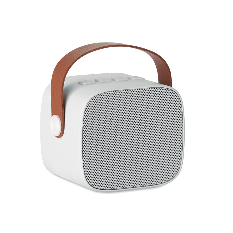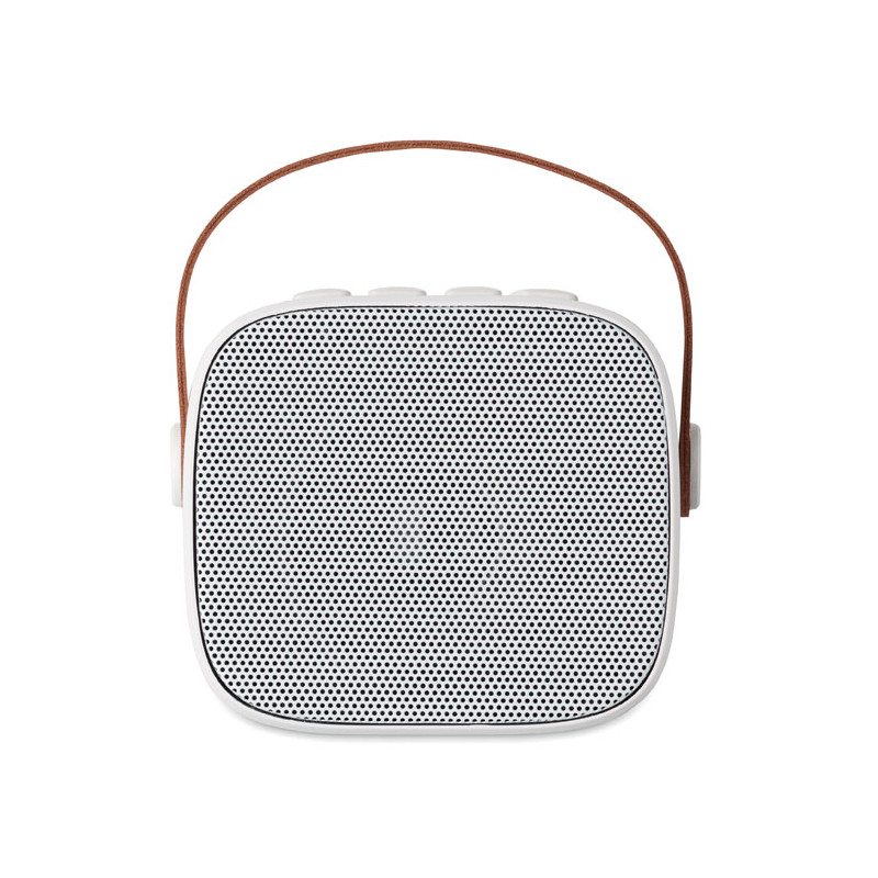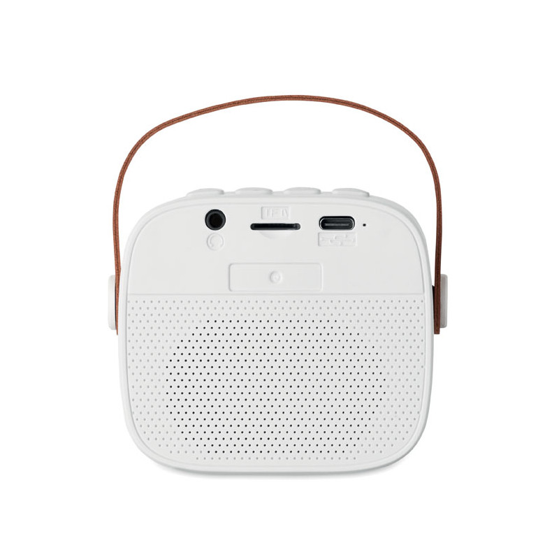 Altavoz inalámbrico 5.0 fabricado en ABS reciclado con asa de PU. Incluye 1 batería recargable Li-ION de 500 mAh. Incluye un puerto para tarjeta SD y un cable AUX/USB. Datos de salida: 5 W, 3 ohmios y 5 V. Tiempo de reproducción aproximado: 4 h.
