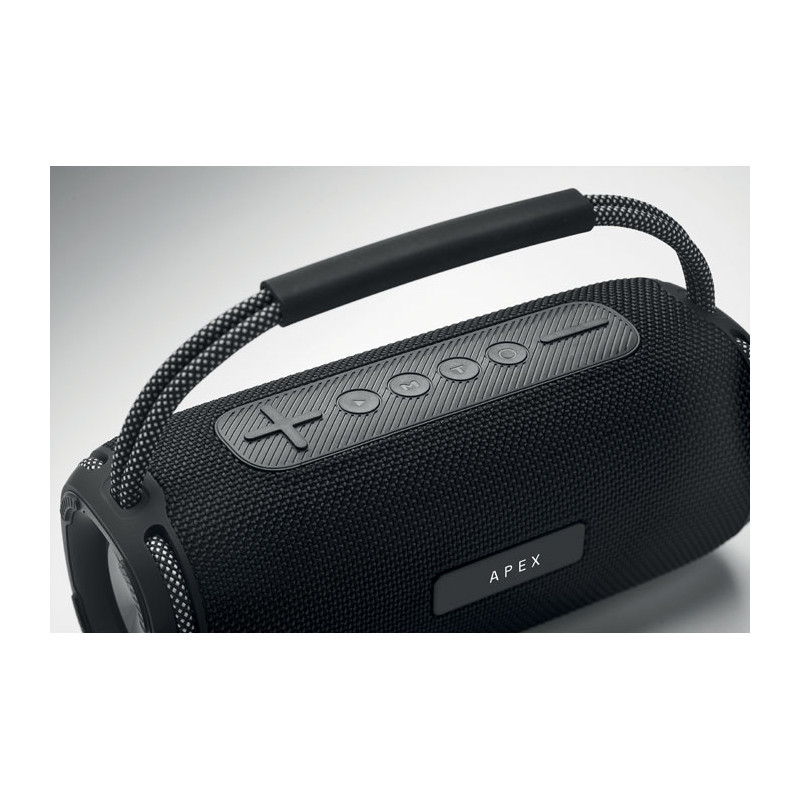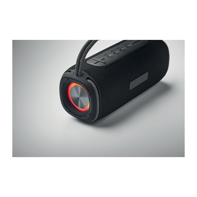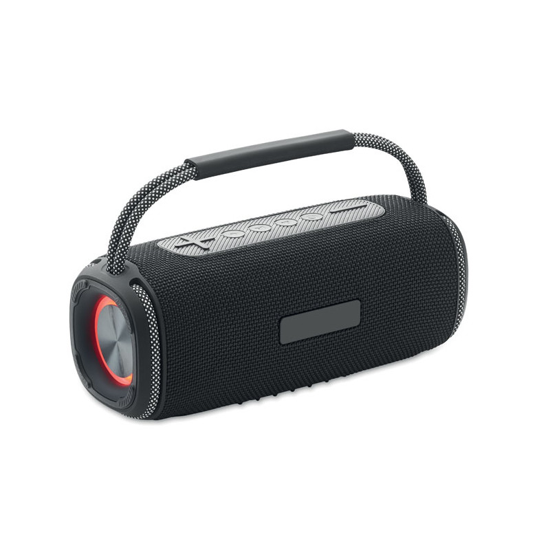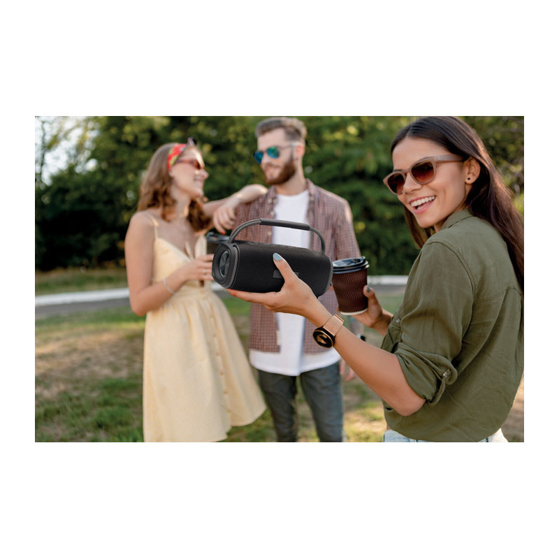 Altavoz portátil inalámbrico estéreo 2x10 W con batería recargable de 2400 mAh. Incluye puertos AUX, USB y TF. Tiempo de reproducción aprox. 5 horas.