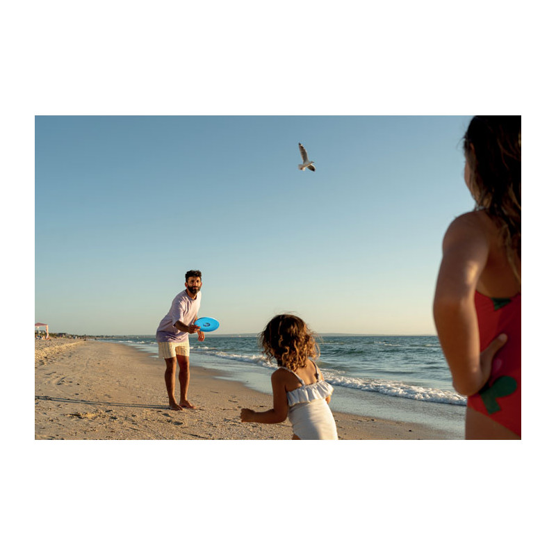 Disco volador frisbee fabricado con material PP oceánico SEAQUAL®. Diámetro 21 cm, grosor 1,2 mm. SEAQUAL INITIATIVE colabora en la limpieza de océanos en todo el mundo.