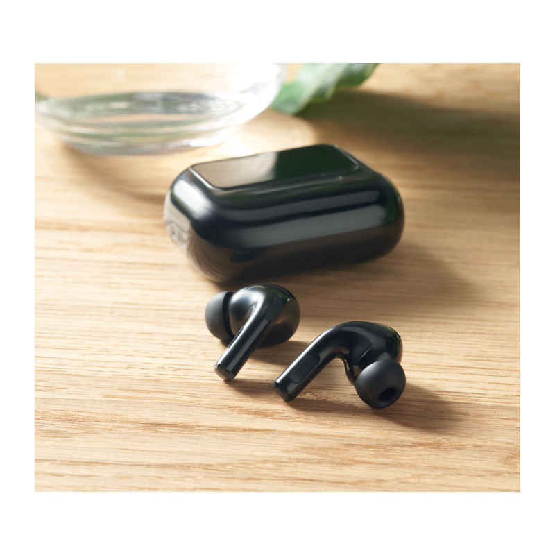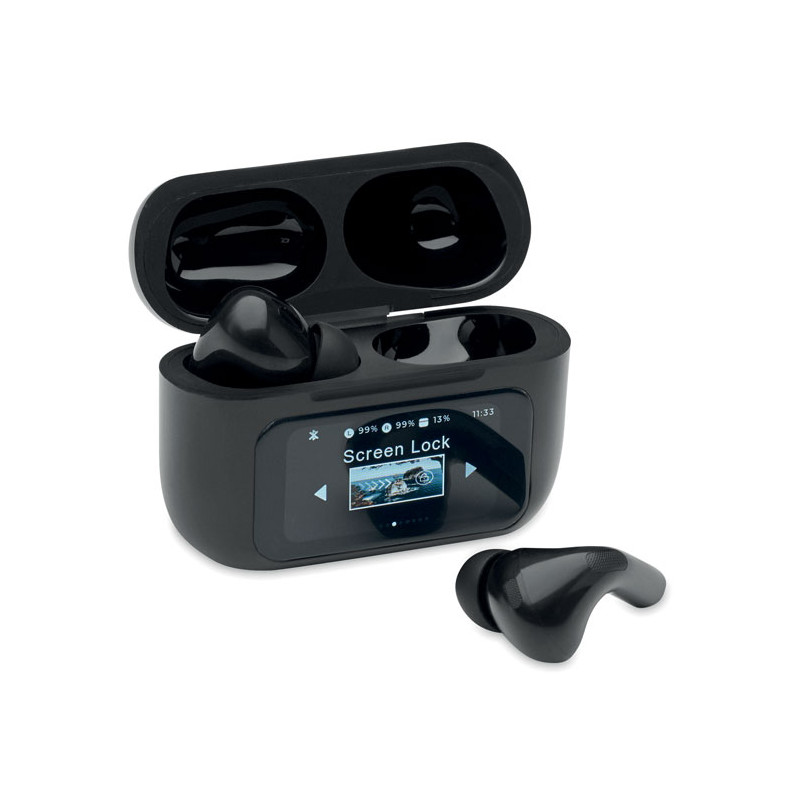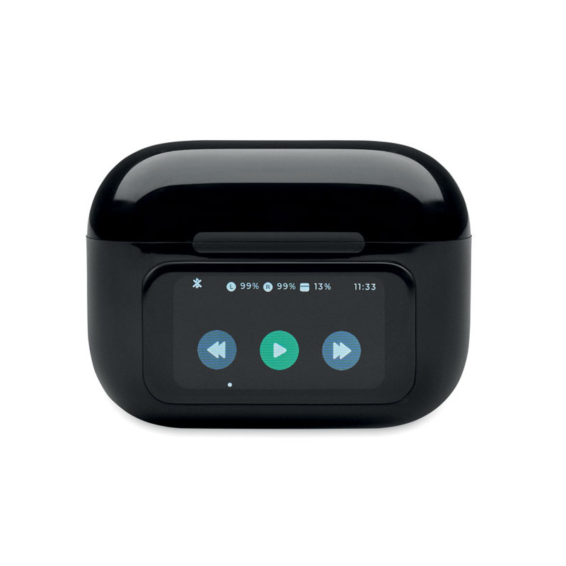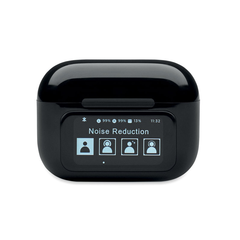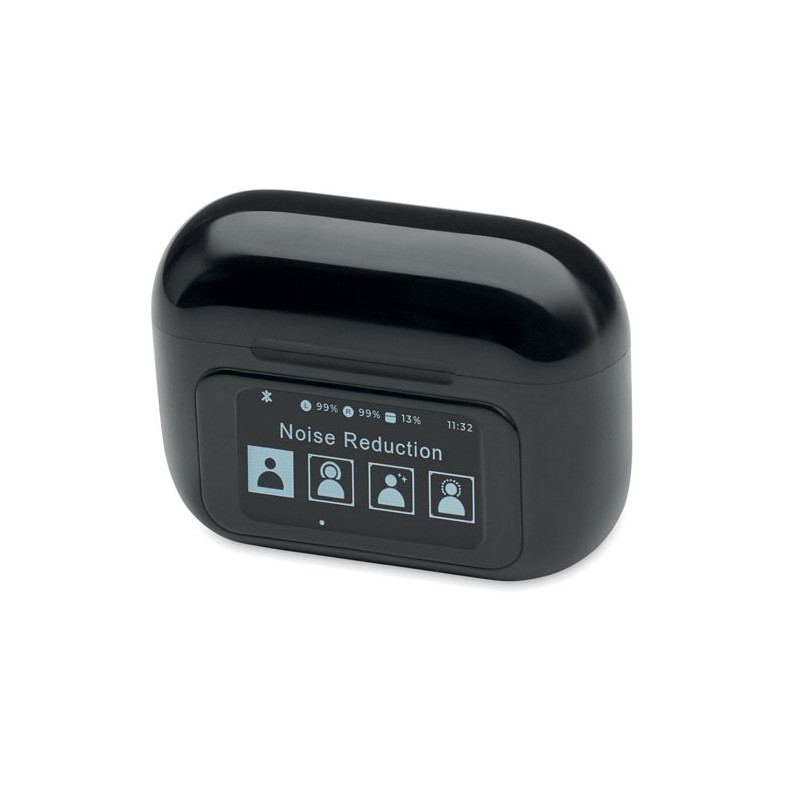 Auriculares estéreo inalámbricos True Wireless Stereo (TWS) 5.0 de ABS (30 mAh) con ANC/ENC y micrófono y base de carga de 230 mAh. Pantalla táctil para control y display.