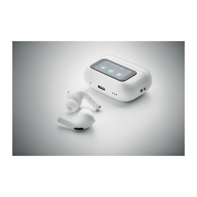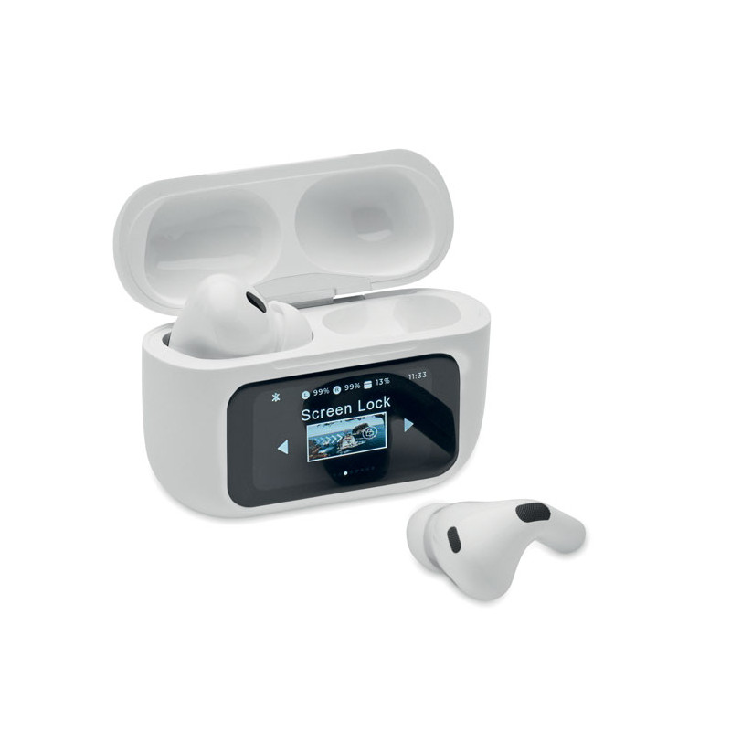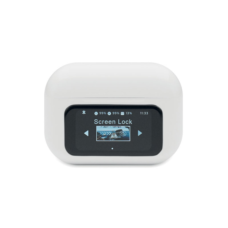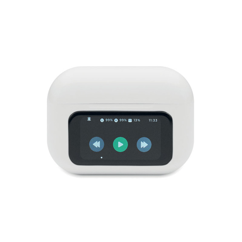 Auriculares estéreo inalámbricos True Wireless Stereo (TWS) 5.0 de ABS (30 mAh) con ANC/ENC y micrófono y base de carga de 230 mAh. Pantalla táctil para control y display.