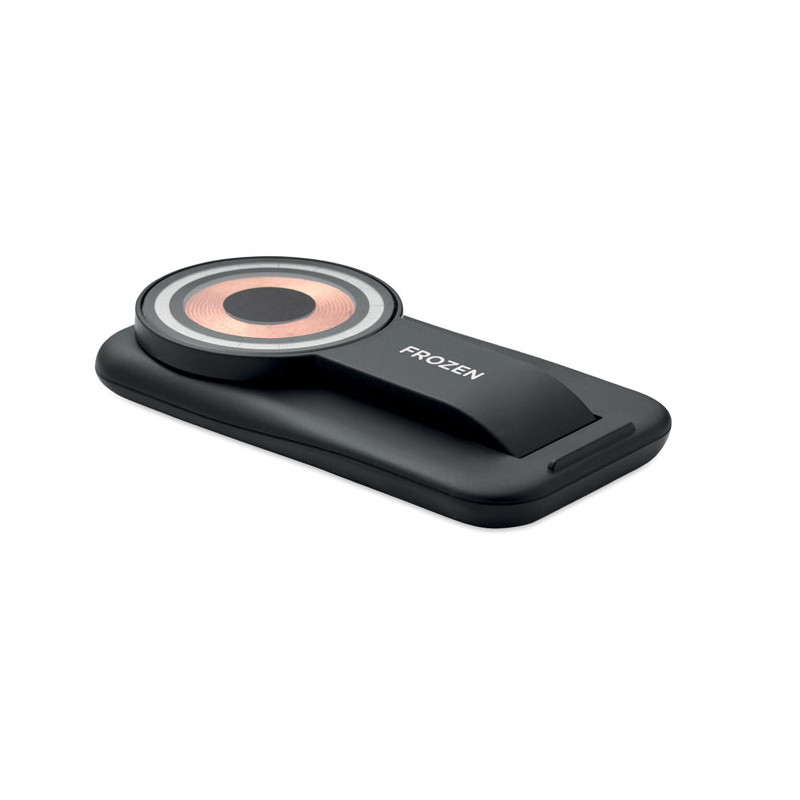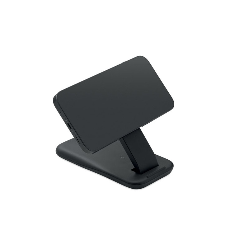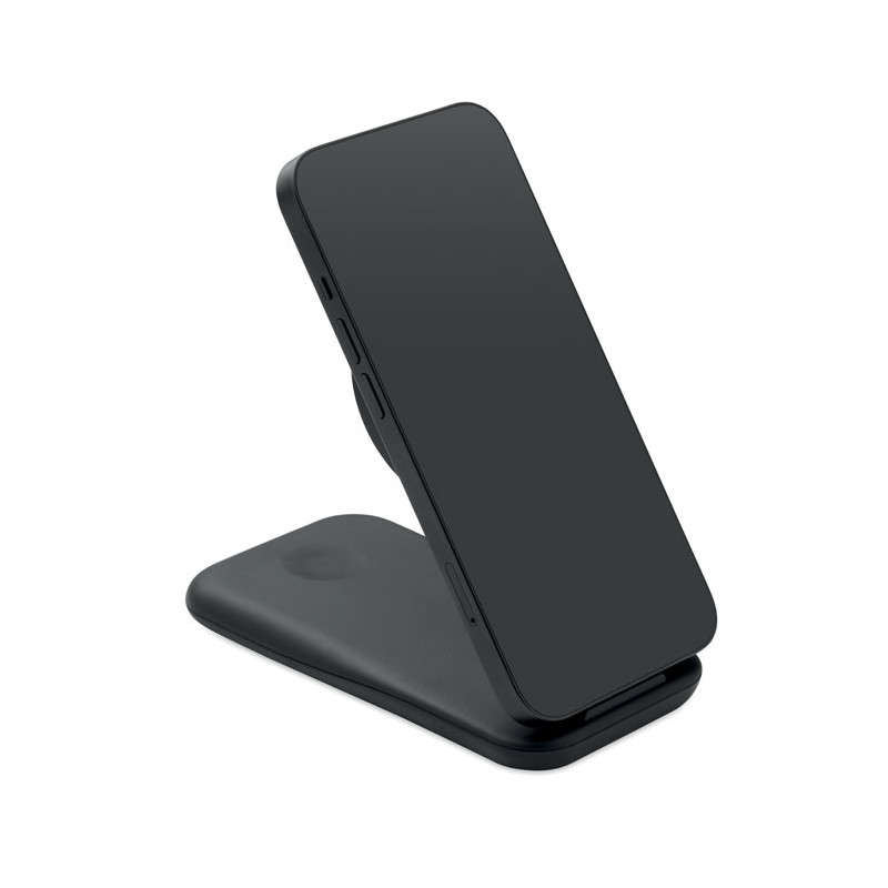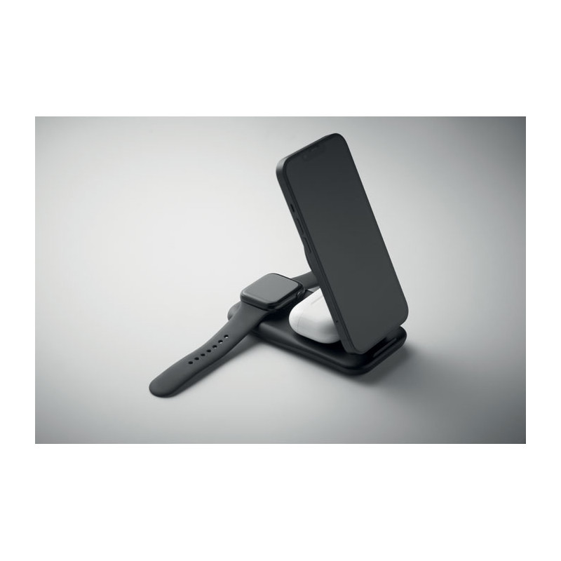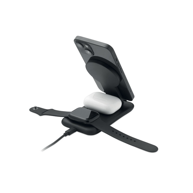Base de carga 3 en 1 en ABS. Incluye un cargador inalámbrico magnético de 15 W con función de soporte para teléfono , cargador TWS y cargador para smartwatch (solo Apple®). Compatible con iPhone® 12 y posteriores.
