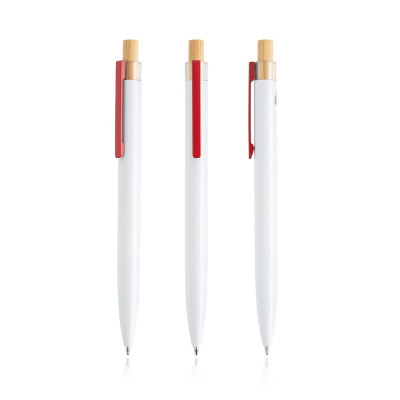 Bolígrafo de aluminio reciclado, con pulsador en bambú. Fabricado en aluminio reciclado, utilizando procesos de fusión y recolección. Al comprar este bolígrafo, está ayudando a reducir las liberaciones de carbono y reducir los desechos que provienen de la no reutilización. Escritura azul.