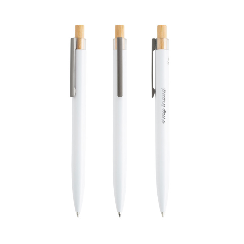 Bolígrafo de aluminio reciclado, con pulsador en bambú. Fabricado en aluminio reciclado, utilizando procesos de fusión y recolección. Al comprar este bolígrafo, está ayudando a reducir las liberaciones de carbono y reducir los desechos que provienen de la no reutilización. Escritura azul.