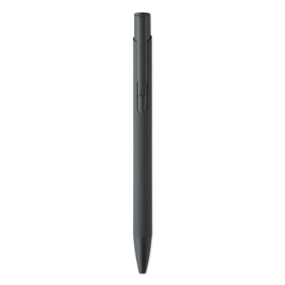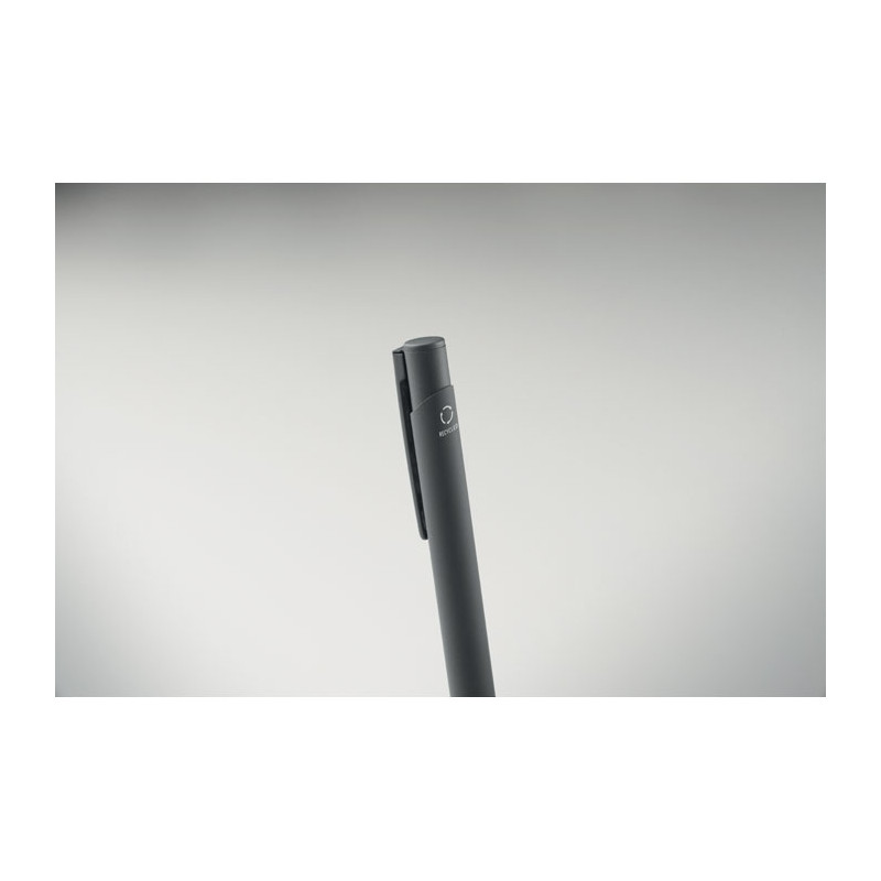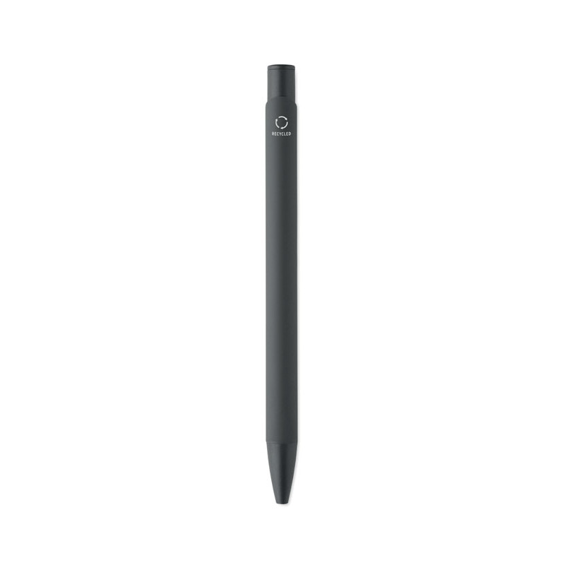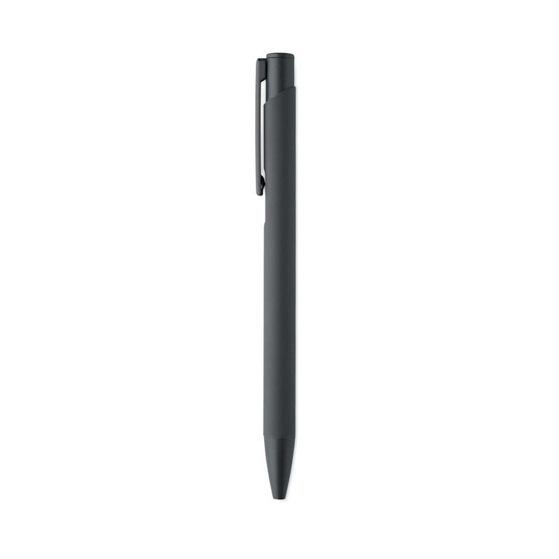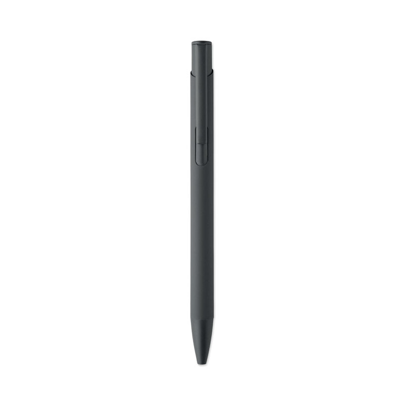 Bolígrafo de aluminio reciclado con clip de hierro y cuerpo engomado en color. Tinta azul.