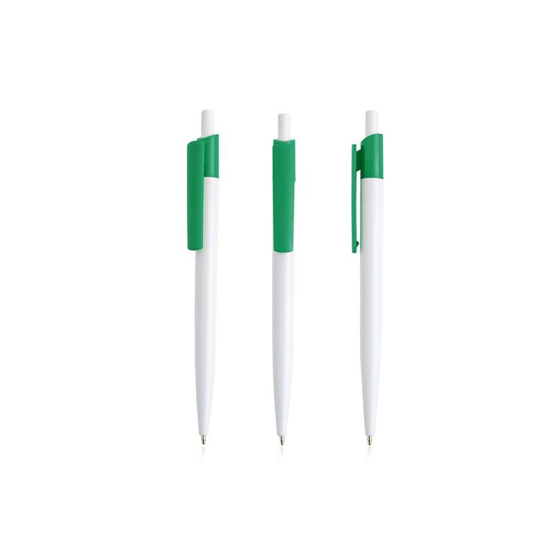 Bolígrafo en ABS reciclado. Un bolígrafo reciclado, de diseño moderno, con clip ancho de color y cuerpo blanco. Este bolígrafo con sistema de pulsación tiene escritura azul. Ver también color de la versión de carrocería 131542.