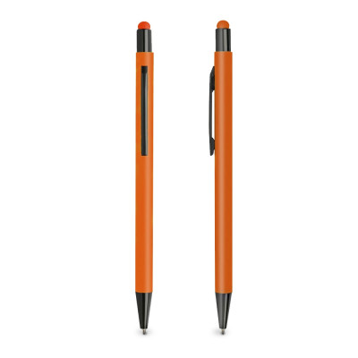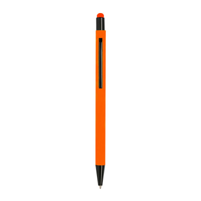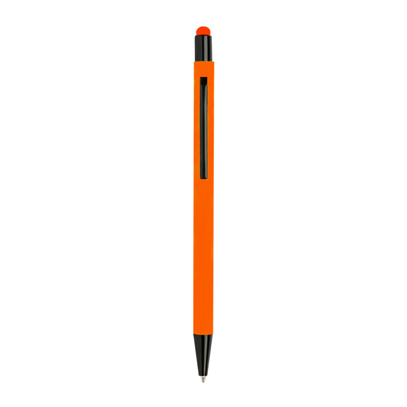 Bolígrafo en aluminio, cuerpo con tacto de caucho, sistema de pulsar. Bolígrafo de cuerpo delgado con un toque delicado. Tiene puntera táctil de color de la carrocería y detalles en negro. Personalice y vea cómo el reconocimiento de su marca pasa de mano en mano.