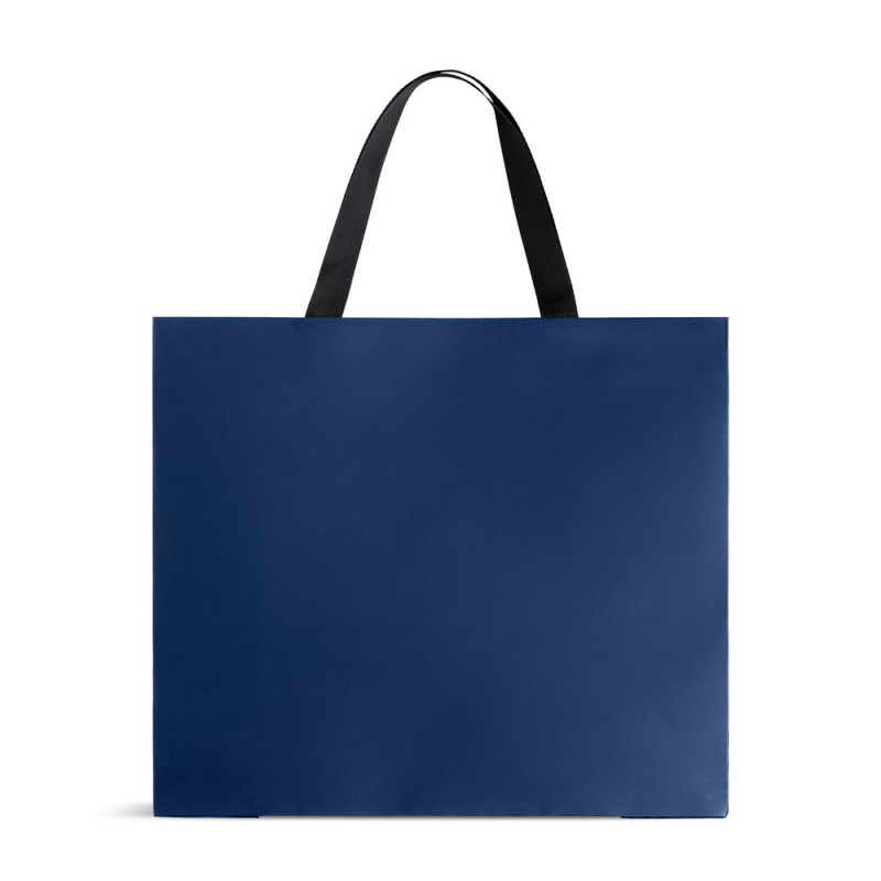Bolsa de papel grande, formato horizontal 40x34x15 cm, con asa de tela en color negro. Papel premium de 250 g con acabado mate, procedente de bosques gestionados de forma responsable. Una bolsa con fondo automático y acabado superior, ideal para tiendas, eventos y regalos especiales. Demuestre el cuidado de su marca en cada entrega: elija la bolsa de papel premium que impresiona a primera vista. Disponible en los colores blanco, negro, rojo, azul marino y natural.