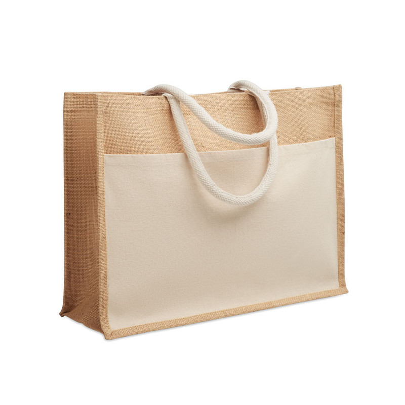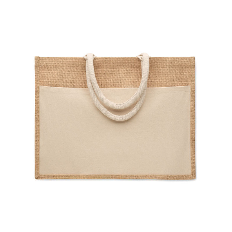 Bolsa de la compra de yute laminado y lona de algodón de 280 gr/m² con asas de cordón. Incluye gran bolsillo frontal abierto.
