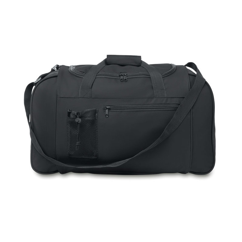 Bolsa deportiva en poliéster 600D con bolsillo frontal y bolsillo de rejilla. Bandolera ajustable y desmontable.