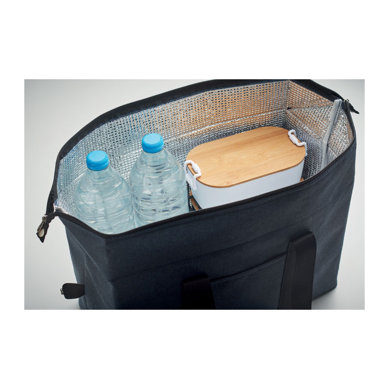 Bolsa nevera de poliéster catiónico RPET 300D. Material de aislamiento: espuma de 3 mm laminada con papel de aluminio. Capacidad 3L.