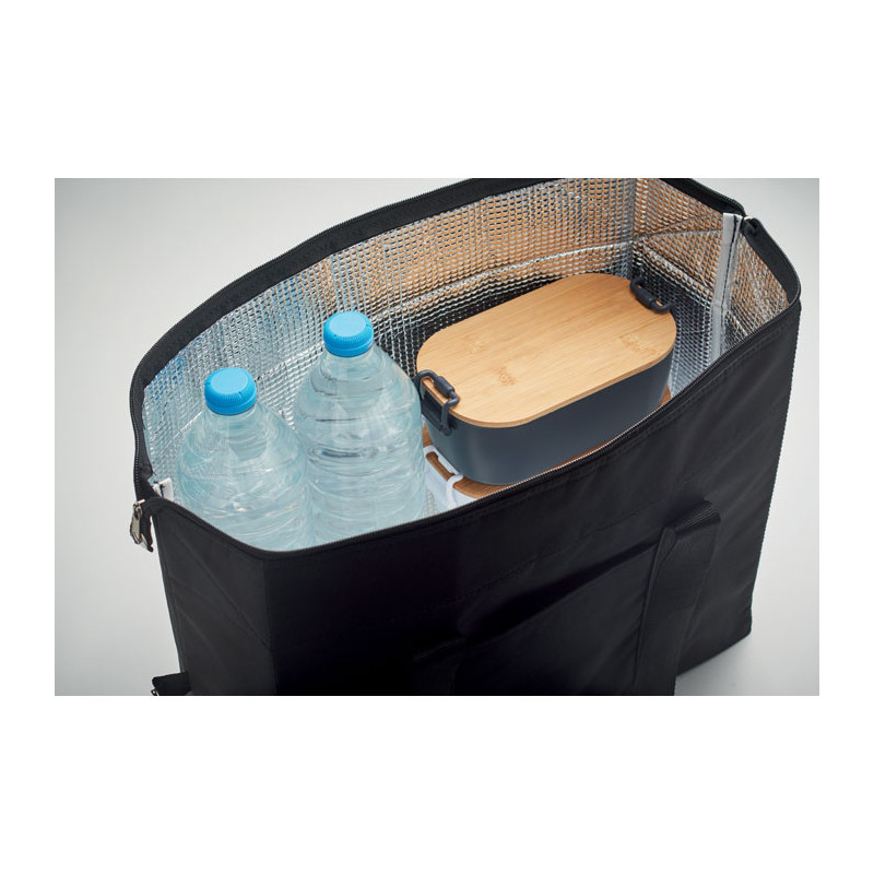 Bolsa nevera de poliéster catiónico RPET 300D. Material de aislamiento: espuma de 3 mm laminada con papel de aluminio. Capacidad 3L.