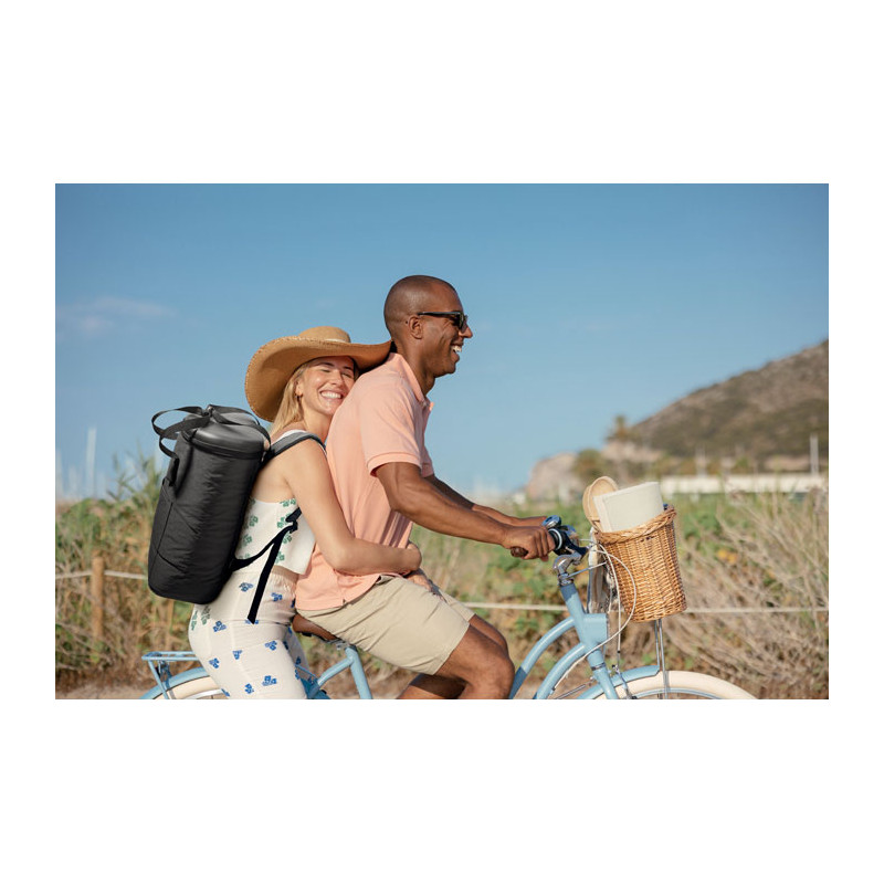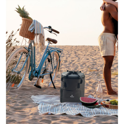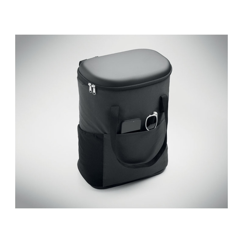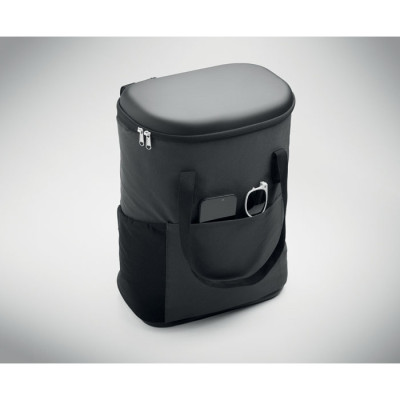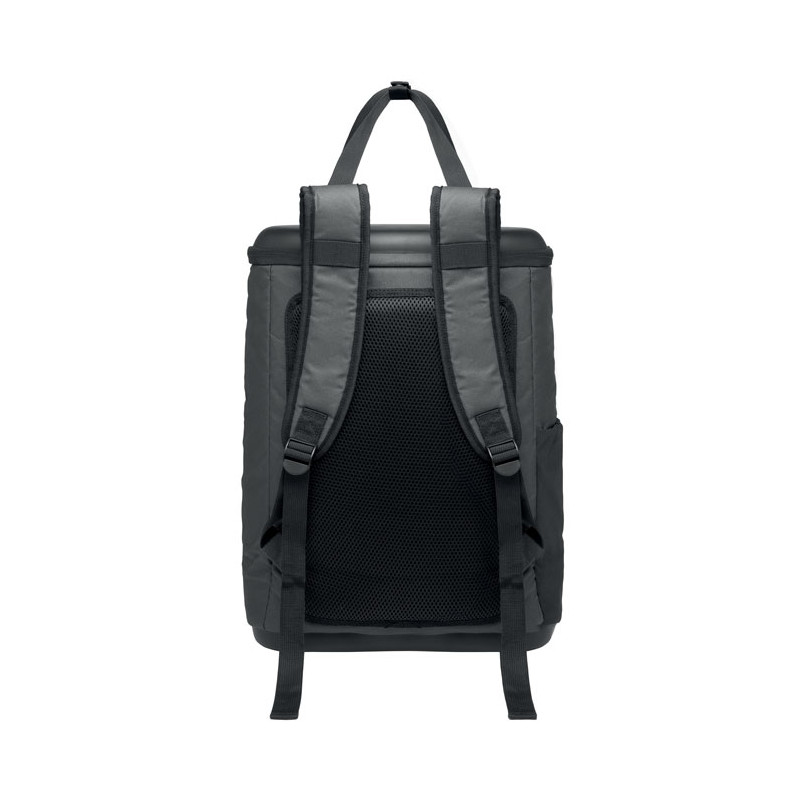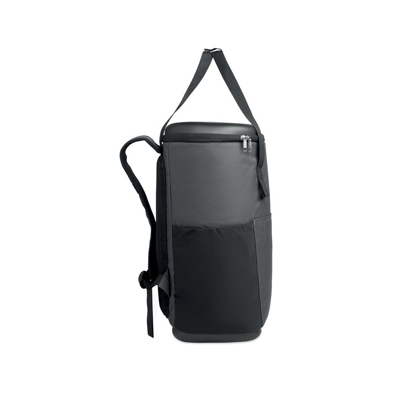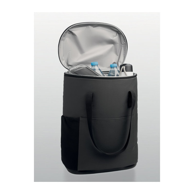 Mochila nevera de RPET 600D repelente al agua con aislamiento de espuma de PE y forro PEVA. espalda de malla acolchada, bolsillo frontal con cremallera y bolsillos laterales. Capacidad 20L.