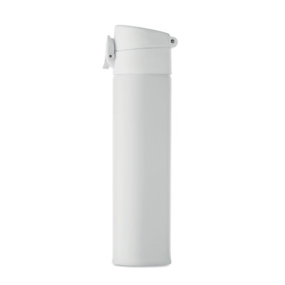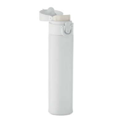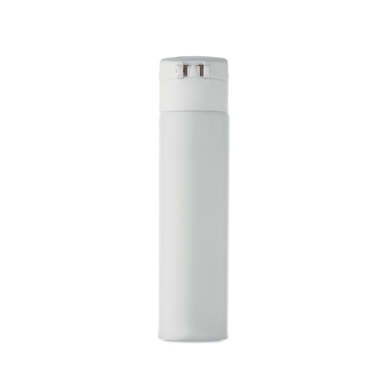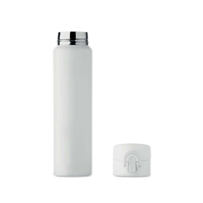Botella de doble pared de acero inoxidable reciclado (90% de acero inoxidable reciclado y 10% de acero inoxidable) con cierre de seguridad en la tapa y opción de apertura a presión. Anti fugas. Capacidad: 300 ml.