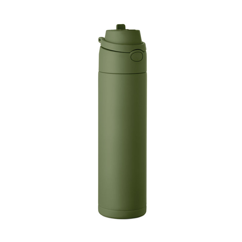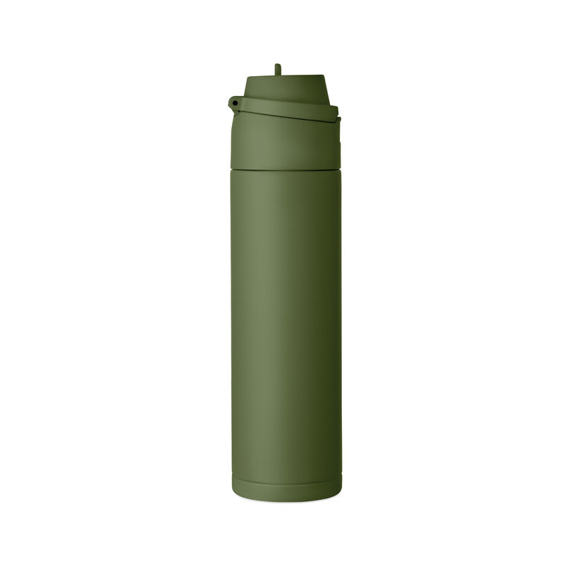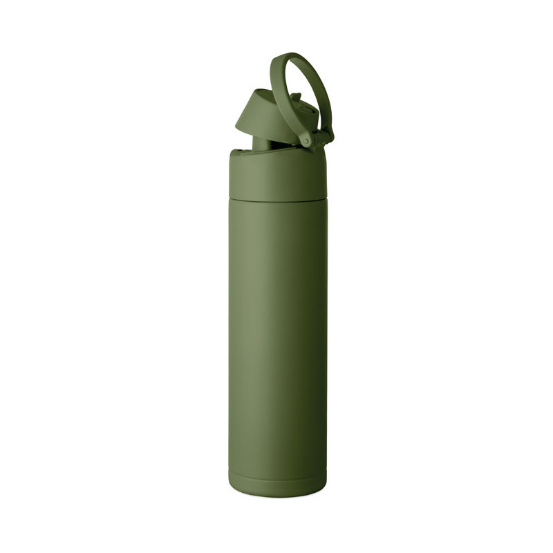 Botella de doble pared de acero inoxidable reciclado (90% de acero inoxidable reciclado y 10% de acero inoxidable). Con pajita 2 en 1 y tapa de PP con asa. Anti fugas. Capacidad: 500 ml.