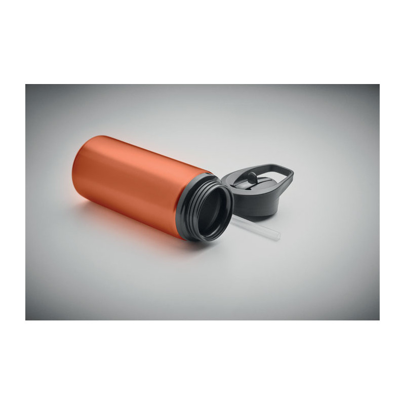 Botella de acero inoxidable reciclado (90% acero inoxidable reciclado y 10% acero inoxidable) de pared simple con boquilla plegable en la tapa, pajita y asa de transporte. Capacidad: 500 ml.