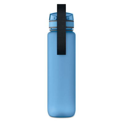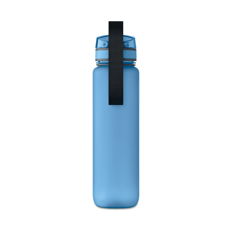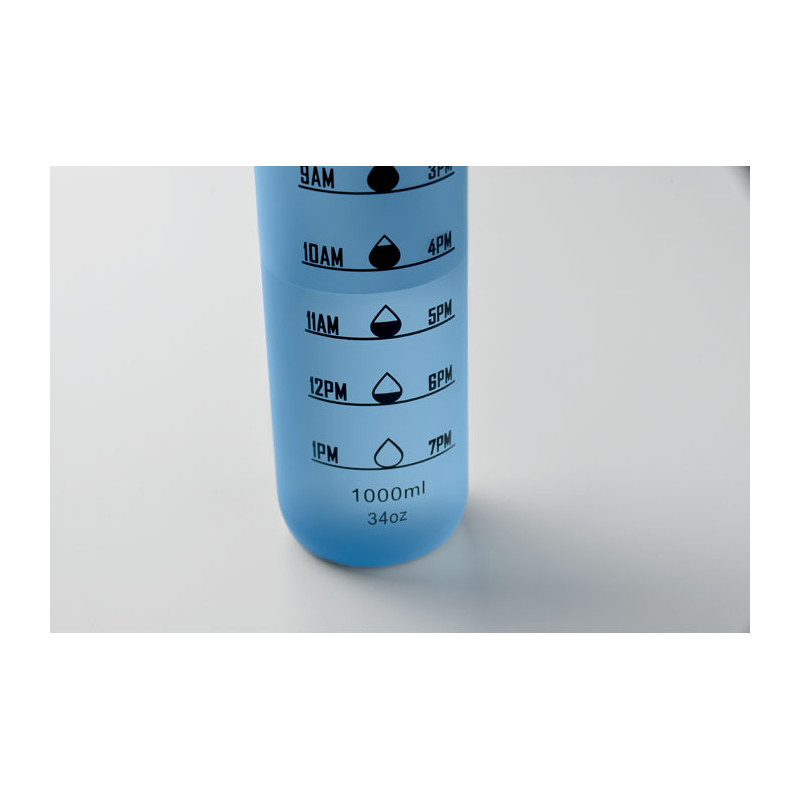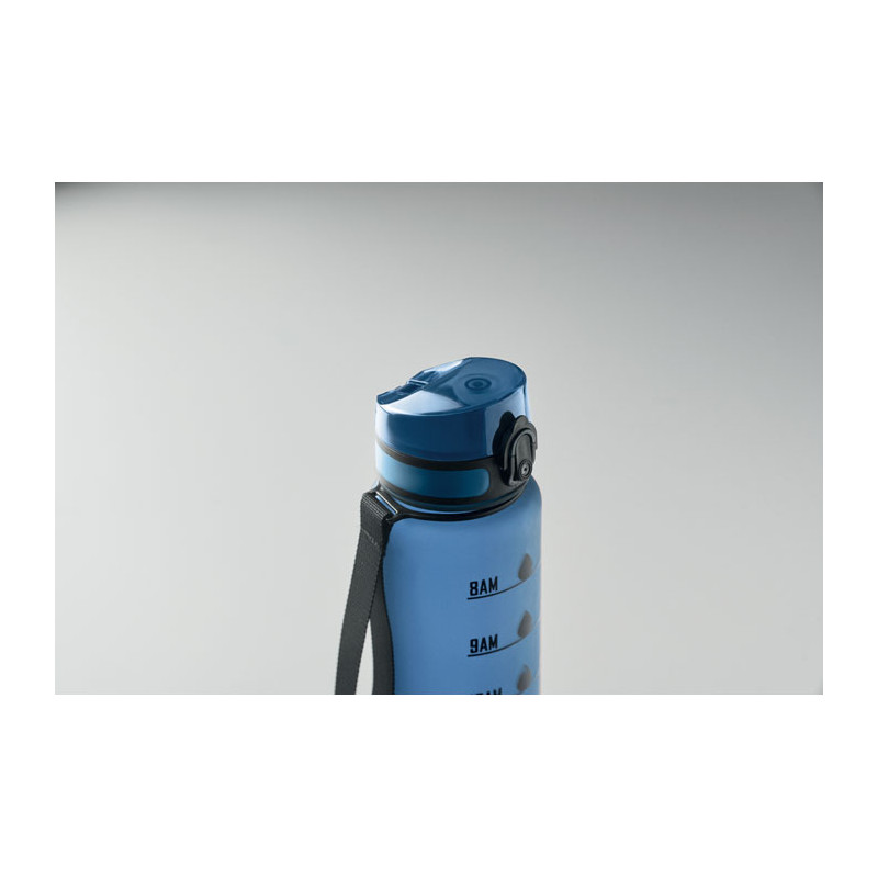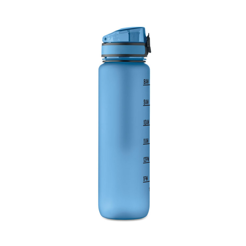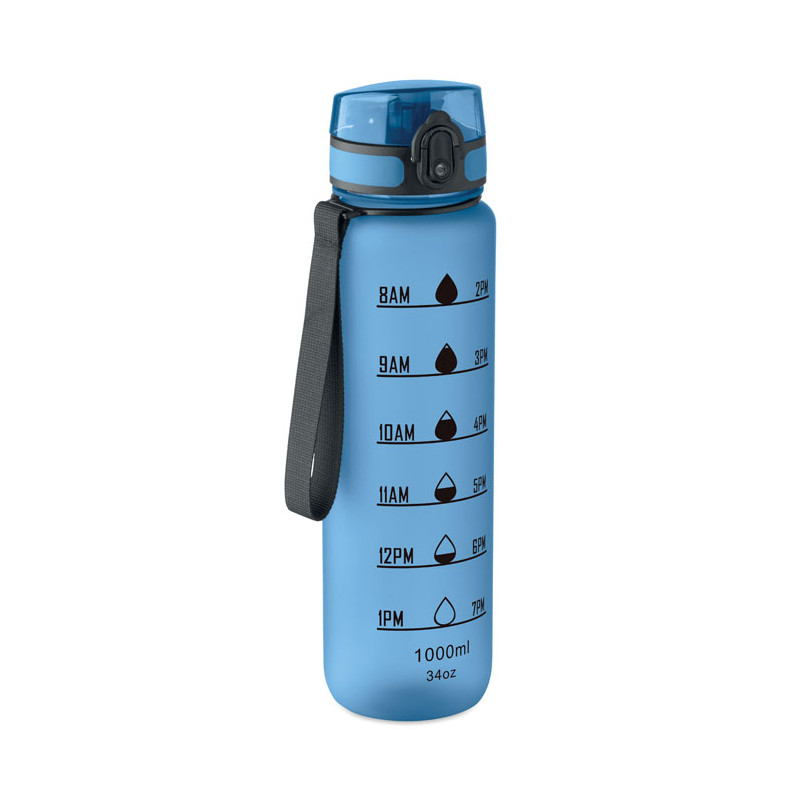 Botella de agua deportiva en RPET, marcas de tiempo motivadoras, tapa abatible que se abre con una sola mano, cierre de seguridad y correa de transporte. Anti fugas. Capacidad: 1L.