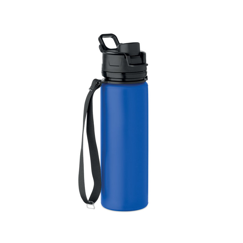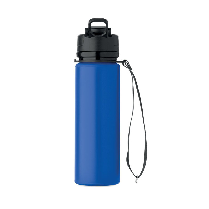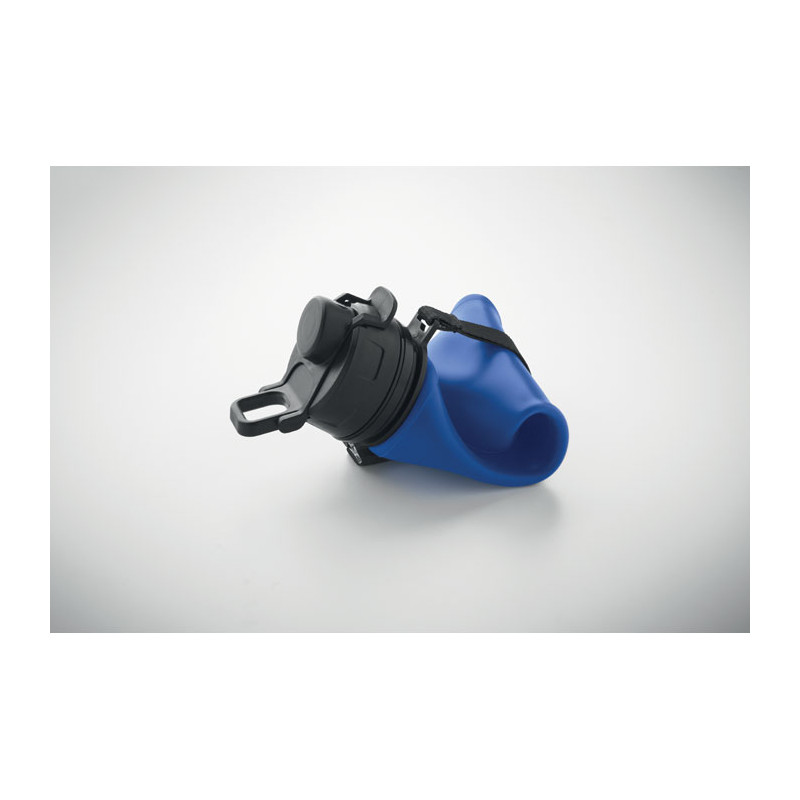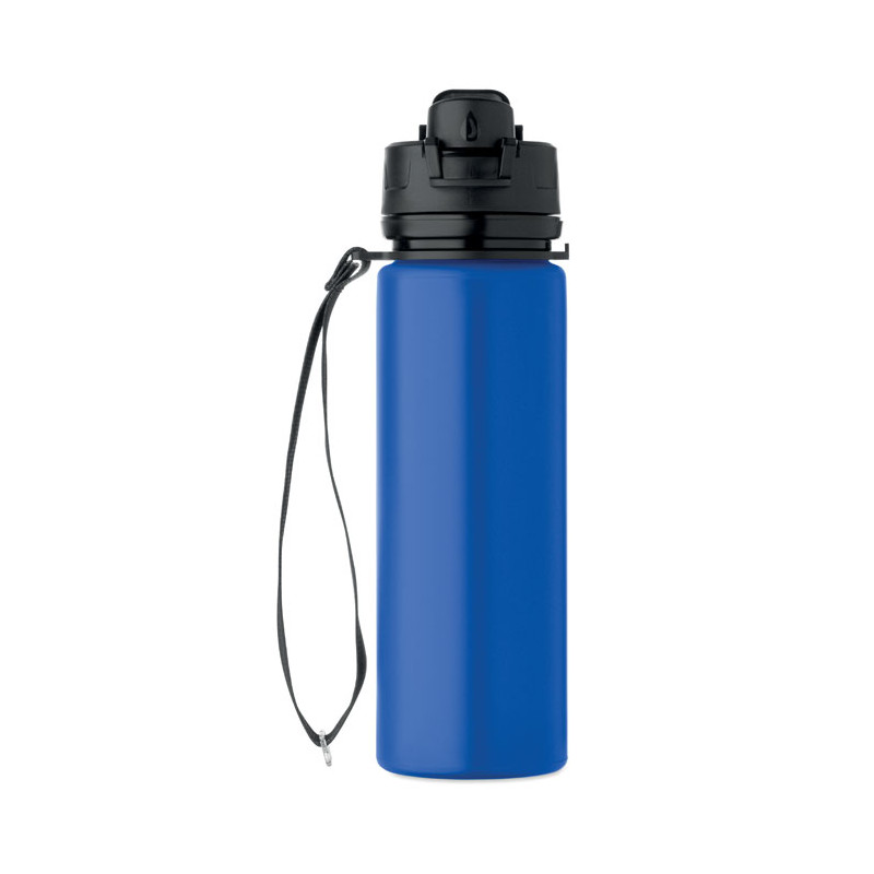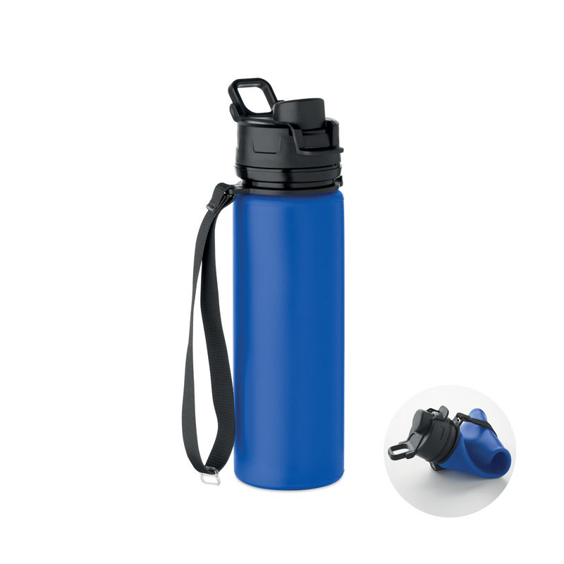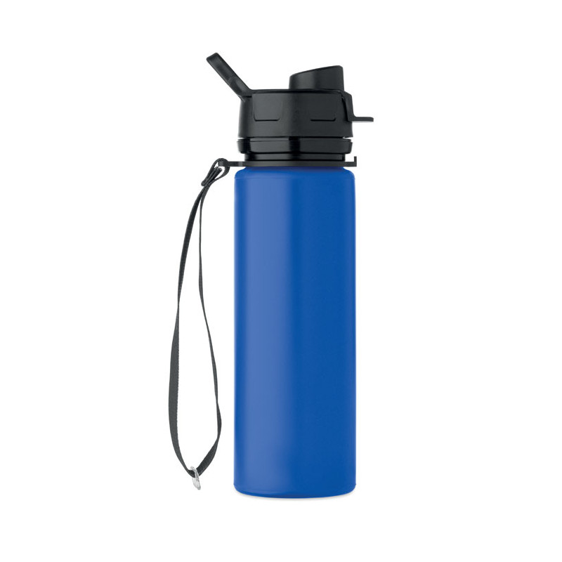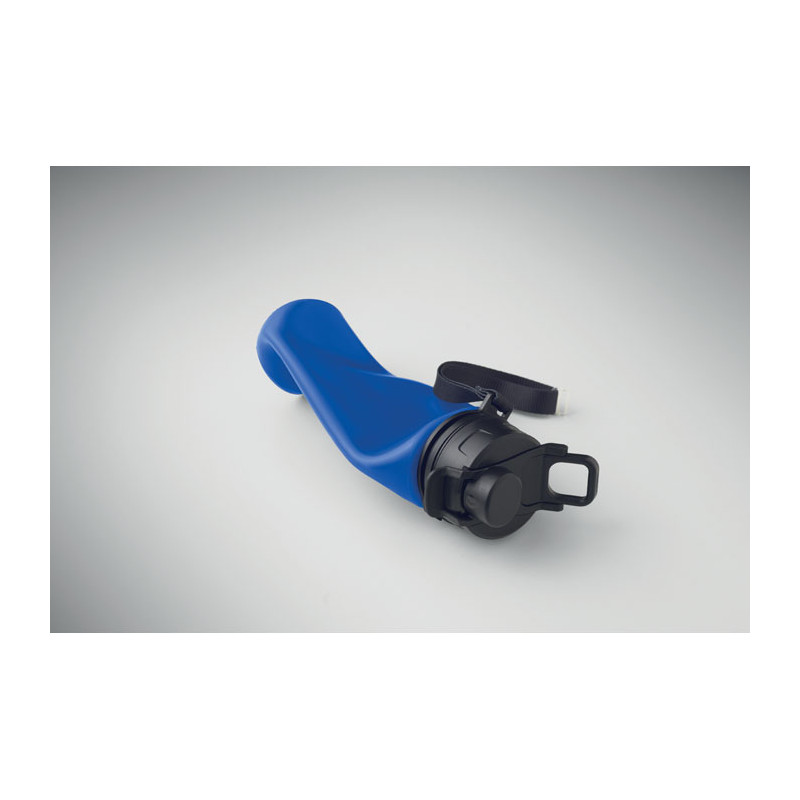 Botella deportiva de silicona plegable con tapa de PP, asa, correa de poliéster y hebilla transparente para asegurarla cuando está plegada. Sin fugas. Capacidad: 500 ml.