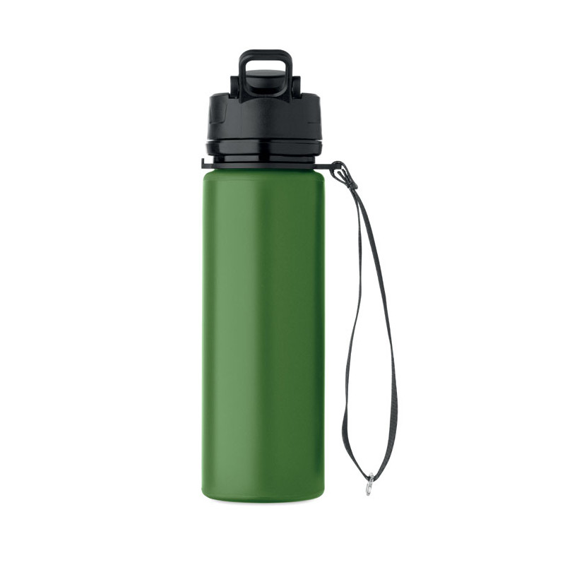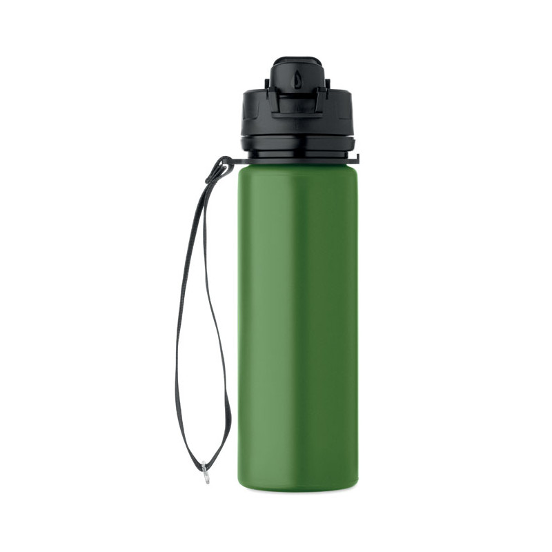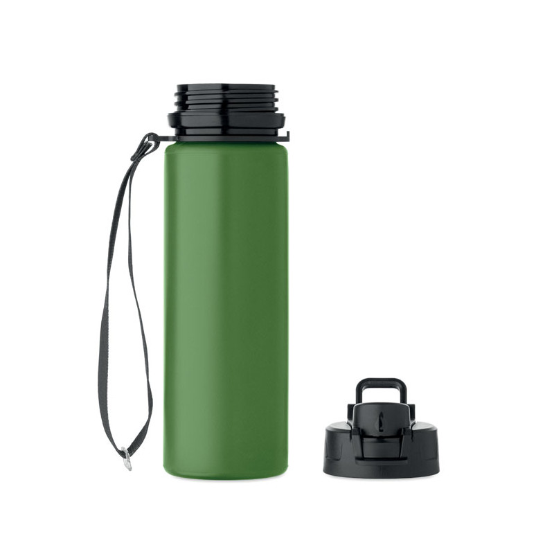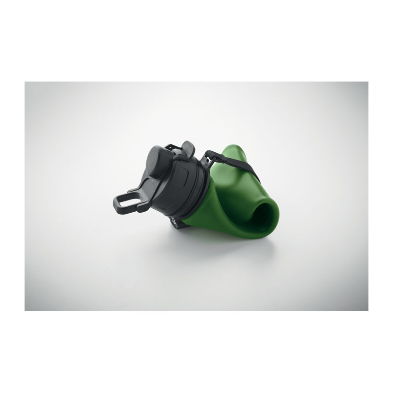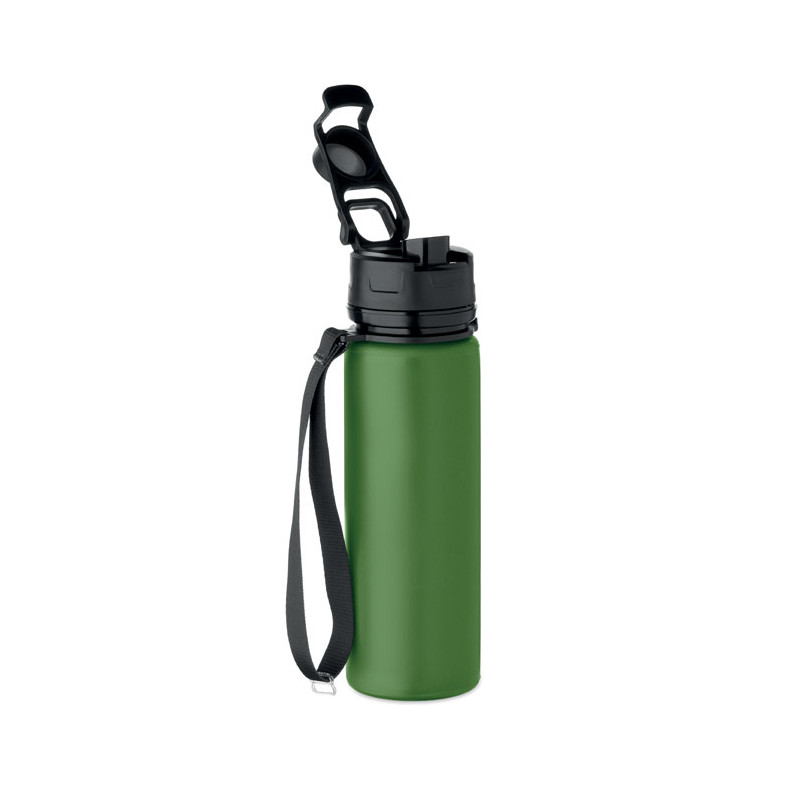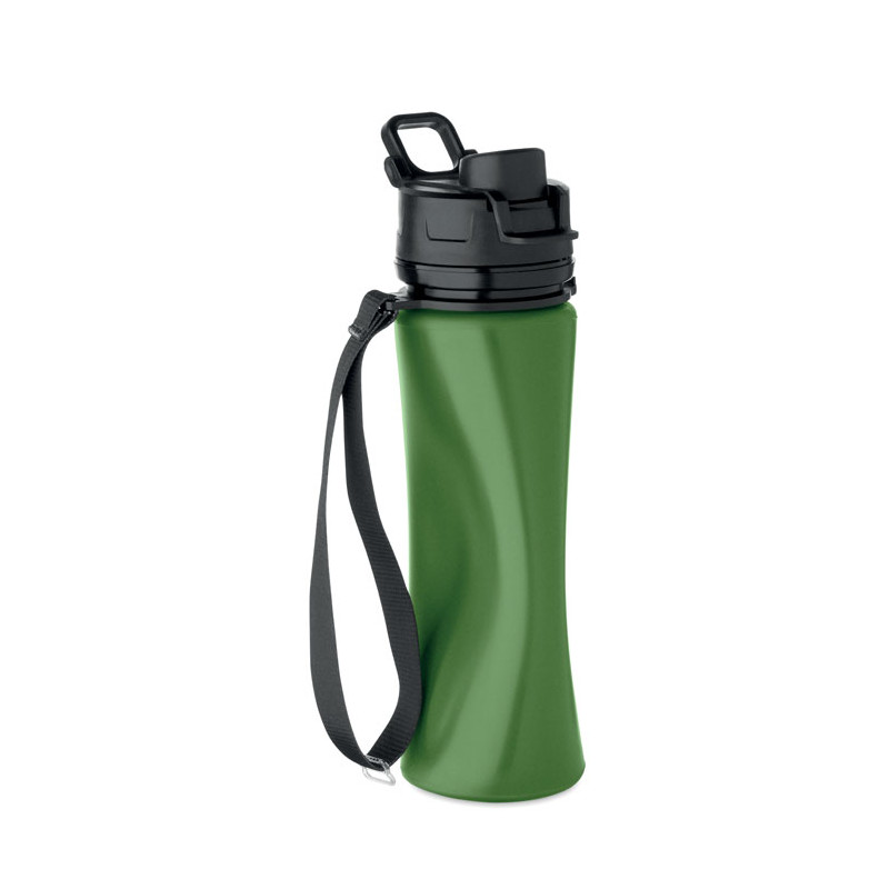 Botella deportiva de silicona plegable con tapa de PP, asa, correa de poliéster y hebilla transparente para asegurarla cuando está plegada. Sin fugas. Capacidad: 500 ml.