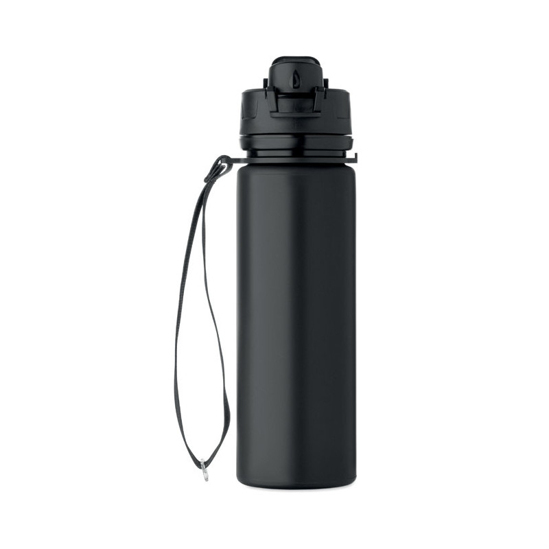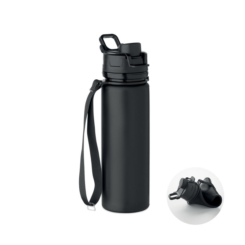 Botella deportiva de silicona plegable con tapa de PP, asa, correa de poliéster y hebilla transparente para asegurarla cuando está plegada. Sin fugas. Capacidad: 500 ml.