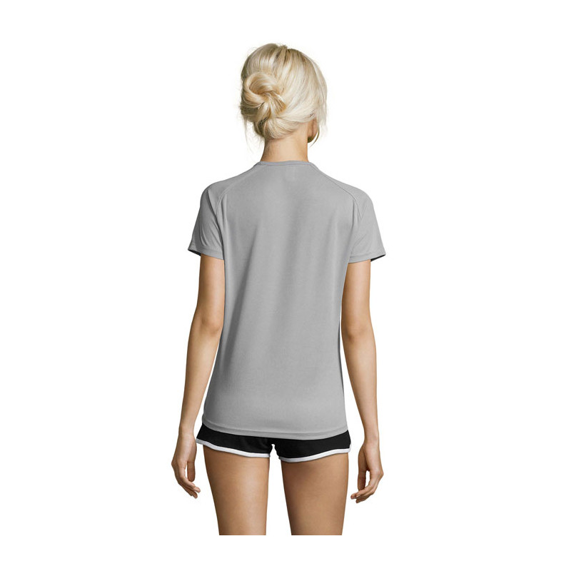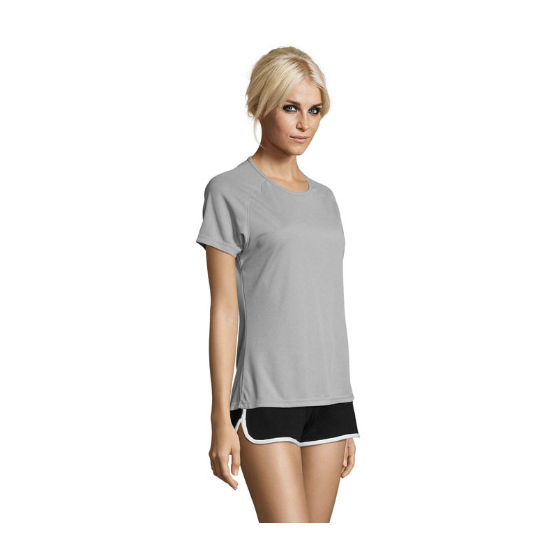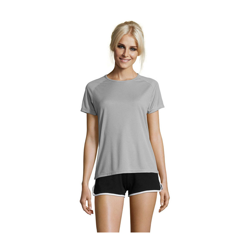 SOL'S SPORTY Camiseta Mujer 140g/m². Su materia transpirable, su corte con mangas raglán y sus costuras planas hacen que sea el producto ideal para practicar deporte. Amplio abanico de tallas y colores, también incluye tonos fluorescentes, 100% poliéster transpirable, ribeteado en el cuello, mangas raglán, espalda más larga. Impresión en Sublimación solo disponible sobre el artículo de color blanco.