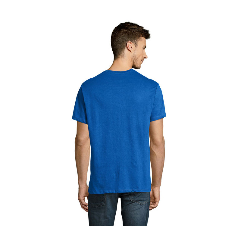Camiseta con escote en V, hecha de 100% algodón semi peinado ringspun de 150 g/m², con costuras reforzadas en el cuello, mangas cortas y 2 cuellos de punto acanalado, tubular. Resistente, clásica y suave en el cuello