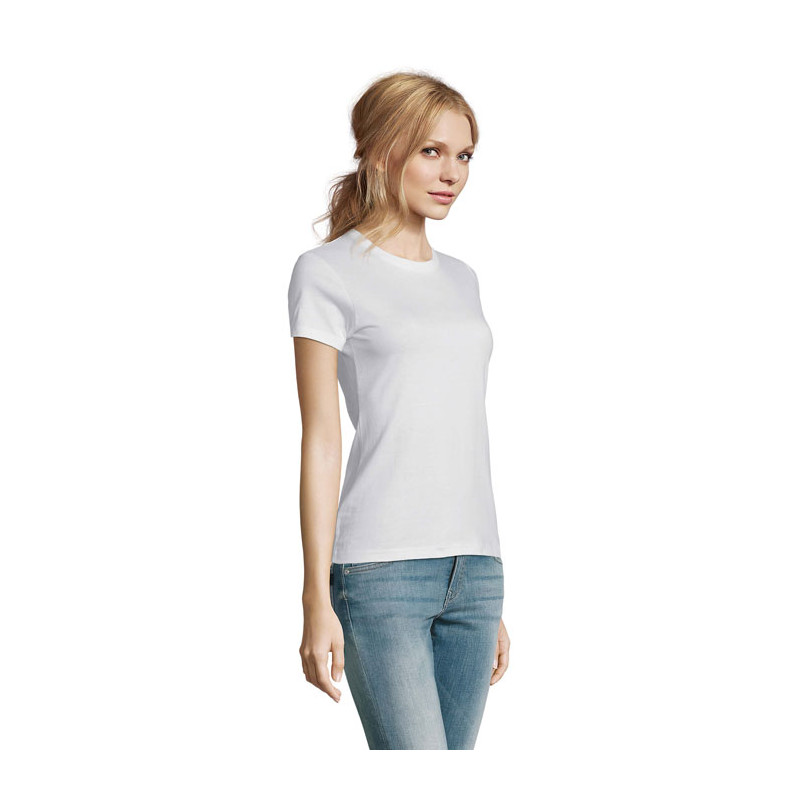 SOL'S IMPERIAL Camiseta para MUJER 190g/m². La Imperial para mujer se ha convertido en la camiseta de referencia de 190 gr/m², gracias a sus acabados, su calidad, sus 25 colores y sus 12 tallas. 100% algodón semipeinado de hilado en anillos, cinta reforzada en el cuello, cuello con acabado de canalé, mangas cortas, costuras laterales