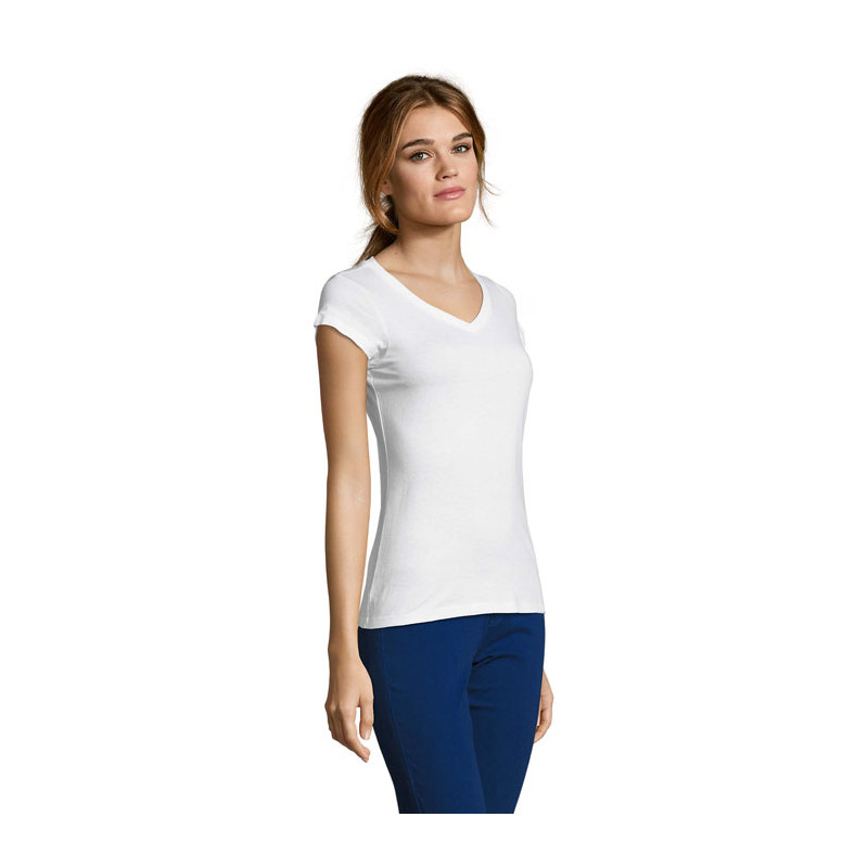 SOL'S MOON Camiseta Mujer 150g/m². Camiseta de referencia con escote de pico para mujeres, corte ajustado, ideal para el mundo de la moda, 100% algodón semi peinado ringspun, tapa costuras reforzado en el cuello, manga corta, corte entallado, cuello pico de punto acanalado con elastano, costuras laterales. .