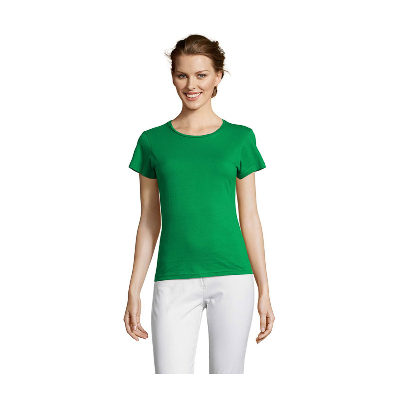 SOL'S MISS Camiseta Mujer 150g/m². Su acabado, su cuello y su amplia gama de colores hacen que esta prenda se diferencie de la competencia, 100% algodón semi peinado ringspun, tapa costuras reforzada en el cuello, escote de punto liso, manga corta, corte entallado, cuello fino, costuras laterales. .