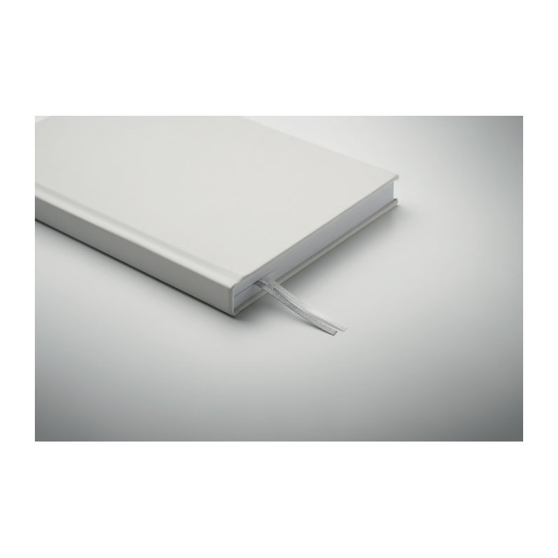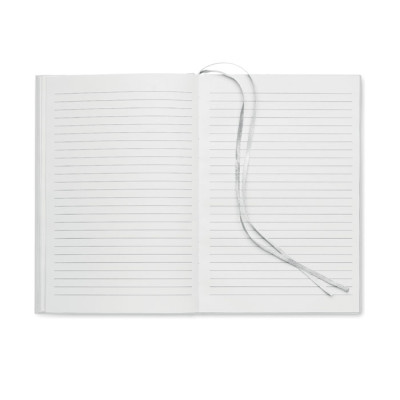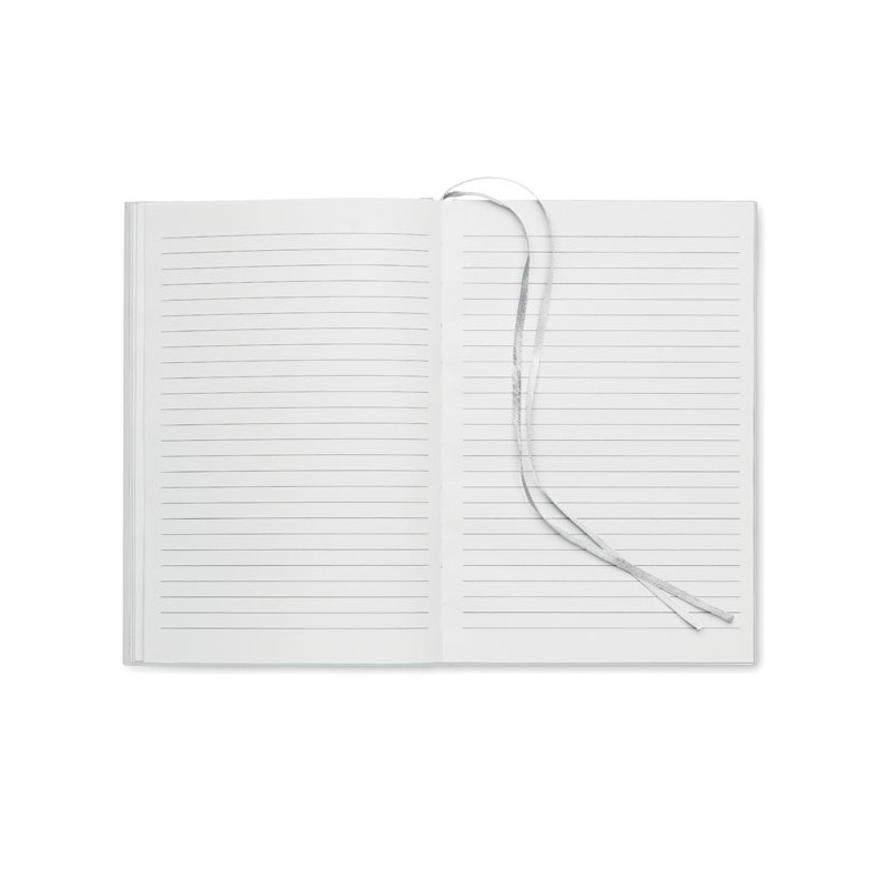 Libreta A5 con cubierta de poliéster reciclado 60% y PU 40%. 256 páginas rayadas en papel reciclado de 70 g/m² (128 hojas). Con 2 marcapáginas de cinta de poliéster.
