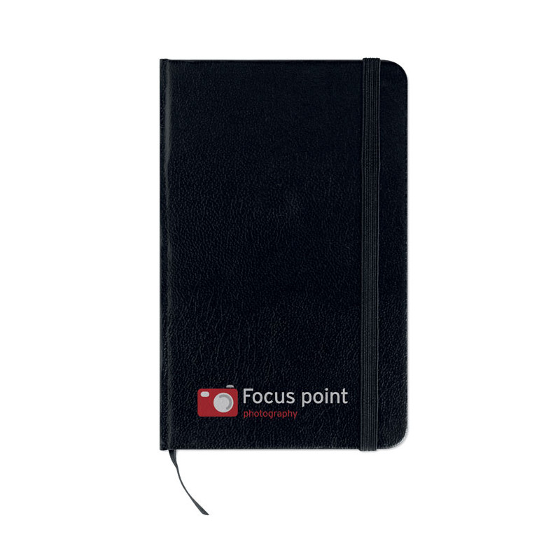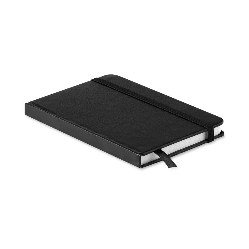 Cuaderno A5 con cubierta de PVC duro. Encuadernado en cartoné. 192 páginas cuadriculadas de papel reciclado (96 hojas). Cinta elástica de cierre y cinta marcapáginas a juego.
