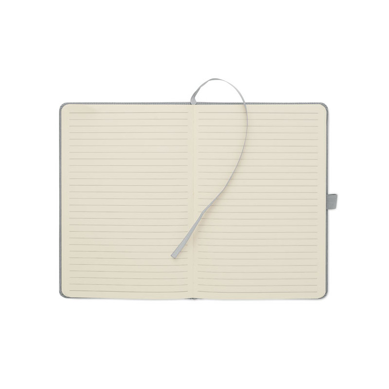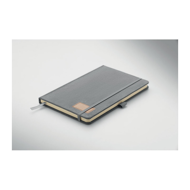 Libreta A5 con cubierta de pana dura de poliéster RPET 192 páginas de papel reciclado rayado (70 gr/m2). Diseño en cartoné. banda elástica y cinta marcapáginas. Etiqueta de papel kraft lavado.