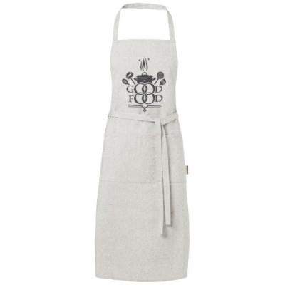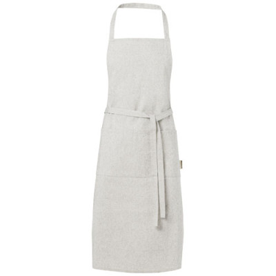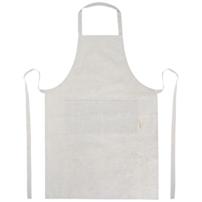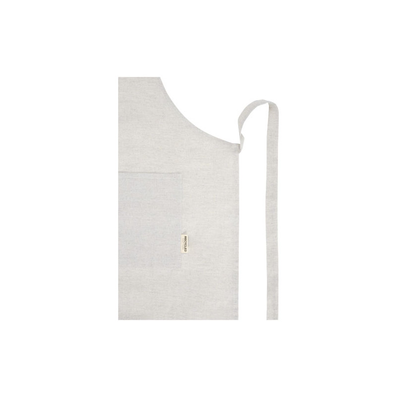 Delantal de mezcla de algodón reciclado y poliéster de 200 g/m². Dispone de 2 bolsillos adyacentes con un tamaño combinado de 45 x 20 cm, y una cinta de 1 metro para atarlo en la parte trasera. El algodón reciclado se fabrica a partir de los residuos preconsumo generados por las fábricas textiles durante el proceso de corte. Debido a la naturaleza del algodón reciclado, puede haber una ligera variación de color. Esta característica le añade claramente una apariencia más auténtica. Longitud de la cinta para el cuello: 55 cm.