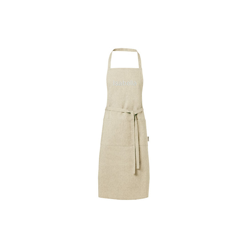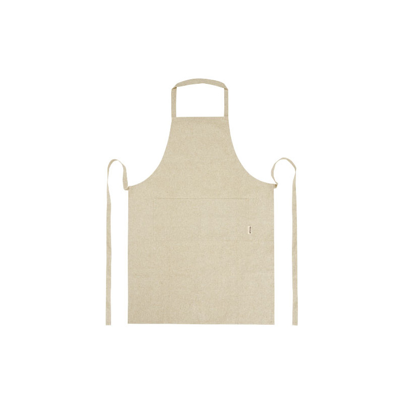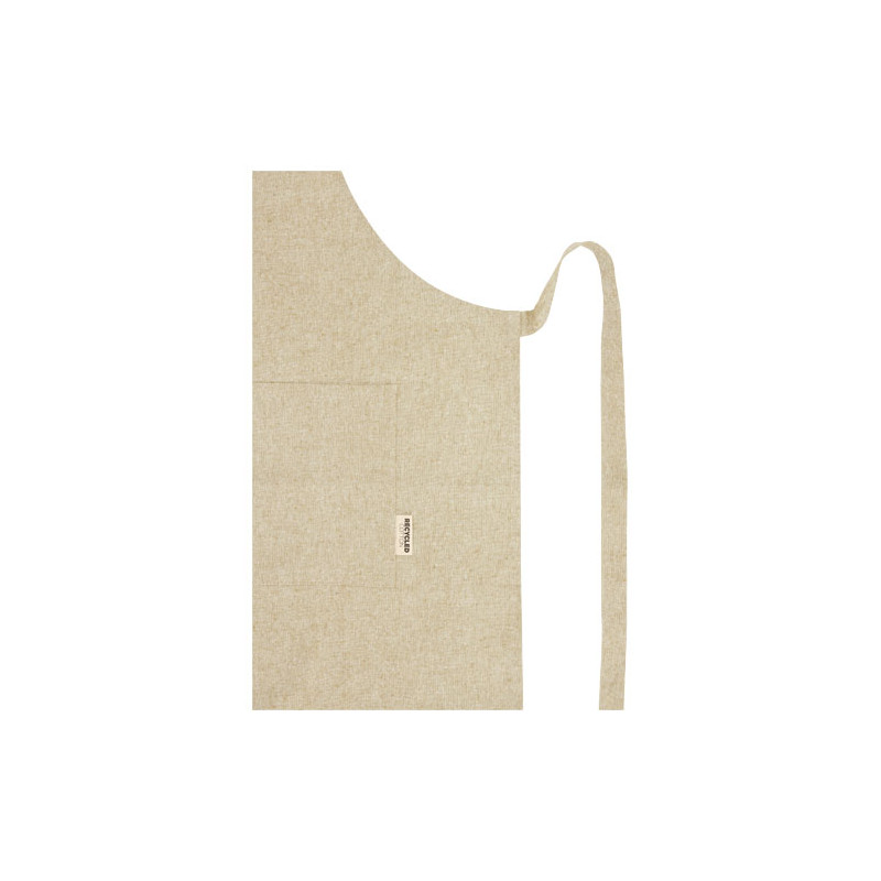 Delantal de mezcla de algodón reciclado y poliéster de 200 g/m². Dispone de 2 bolsillos adyacentes con un tamaño combinado de 45 x 20 cm, y una cinta de 1 metro para atarlo en la parte trasera. El algodón reciclado se fabrica a partir de los residuos preconsumo generados por las fábricas textiles durante el proceso de corte. Debido a la naturaleza del algodón reciclado, puede haber una ligera variación de color. Esta característica le añade claramente una apariencia más auténtica. Longitud de la cinta para el cuello: 55 cm.