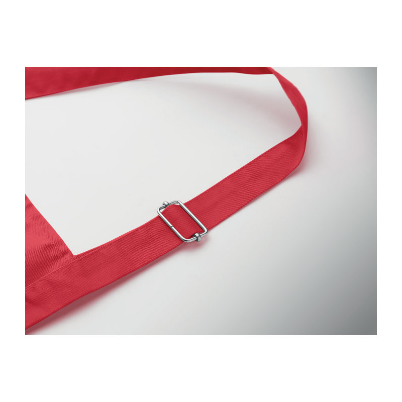 Delantal de cocina largo y ajustable de polialgodón de 240 gr/m² (35% algodón, 65% poliéster) con dos bolsillos delanteros y correa ajustable con hebilla metálica.