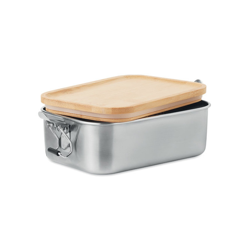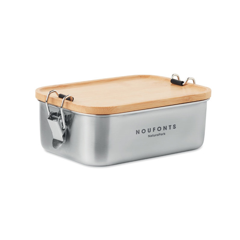 Fiambrera de acero inoxidable con fuertes hebillas de cierre laterales y tapa de bambú. Lleva tu comida favorita al trabajo o a un picnic. Llevar una comida casera es una forma saludable de disfrutar del almuerzo. Con una capacidad de 750 ml puedes llevar suficiente comida para un día. El acero inoxidable y las hebillas laterales se encargan de que tu comida se conserve fresca. La tapa de bambú da a la fiambrera un aspecto natural y elegante. El bambú es un producto natural, puede haber ligeras variaciones de color y tamaño en cada artículo, lo que puede afectar al resultado final de la impresión. Este artículo va presentado: en caja individual