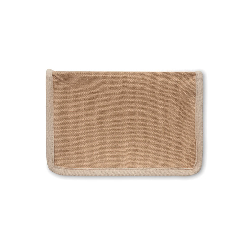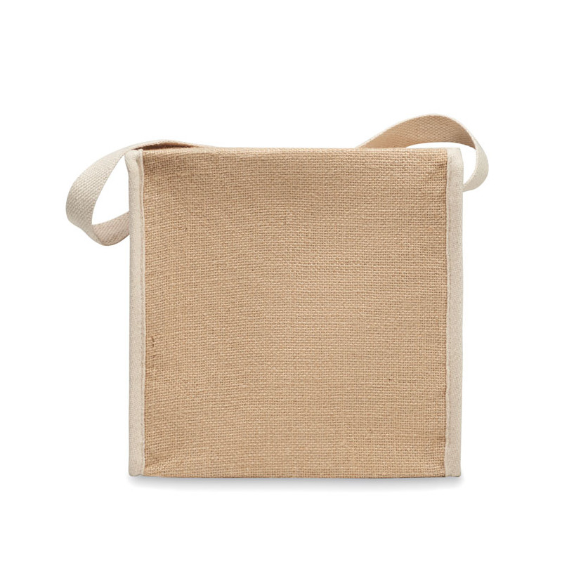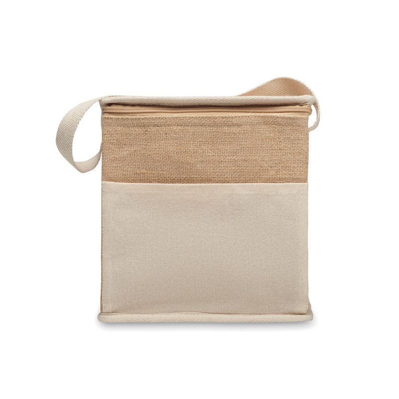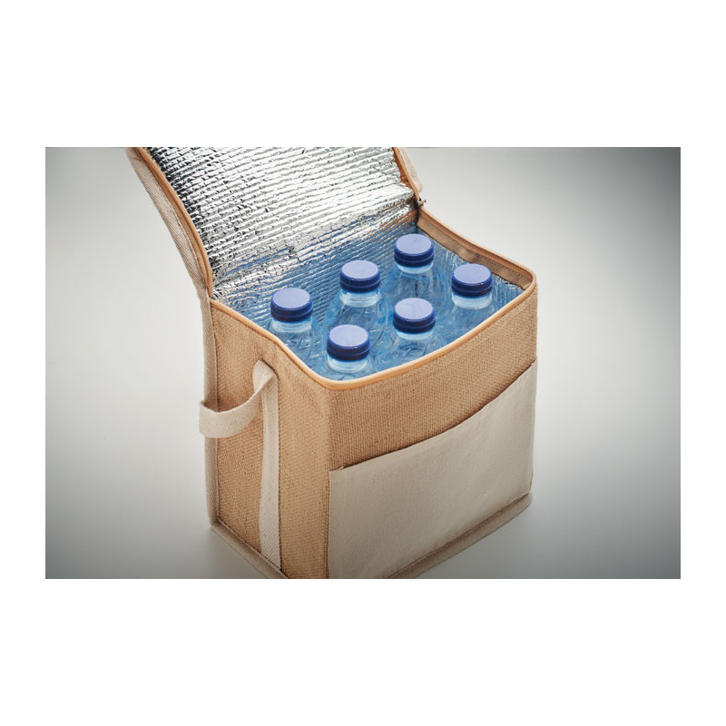 Bolsa nevera de yute con asa de algodón y bolsillo frontal. Capacdidad para 6 botellas de 0,5 L. Material de aislamiento: lámina de aluminio de 3 mm. Capacidad 3L.