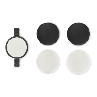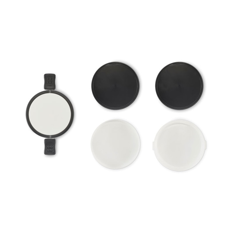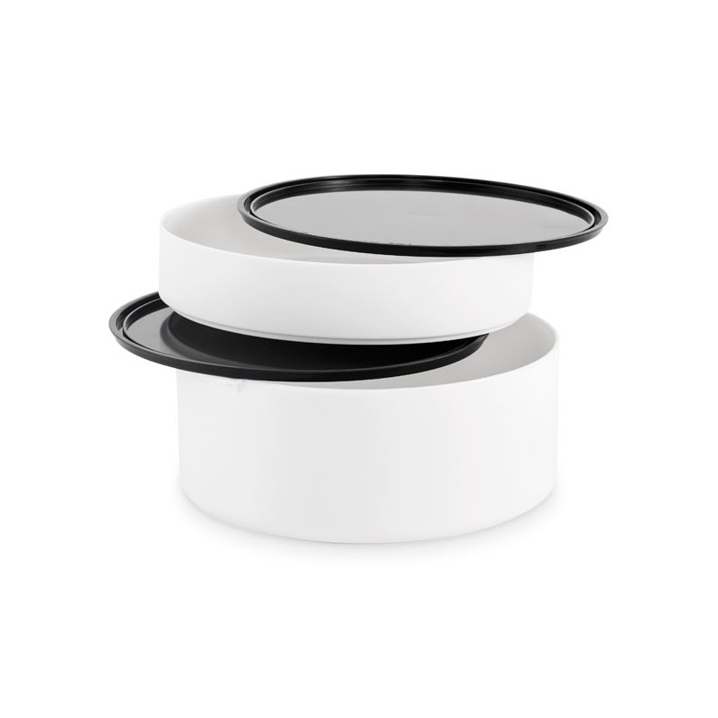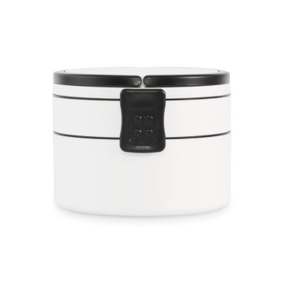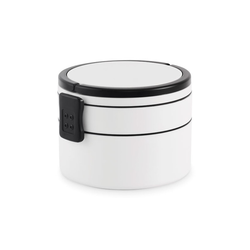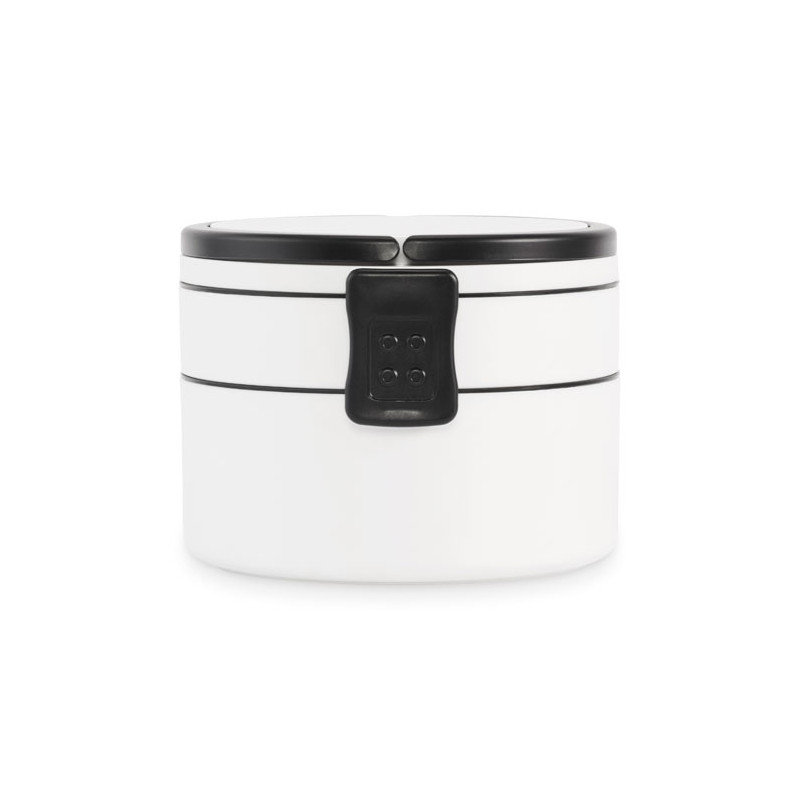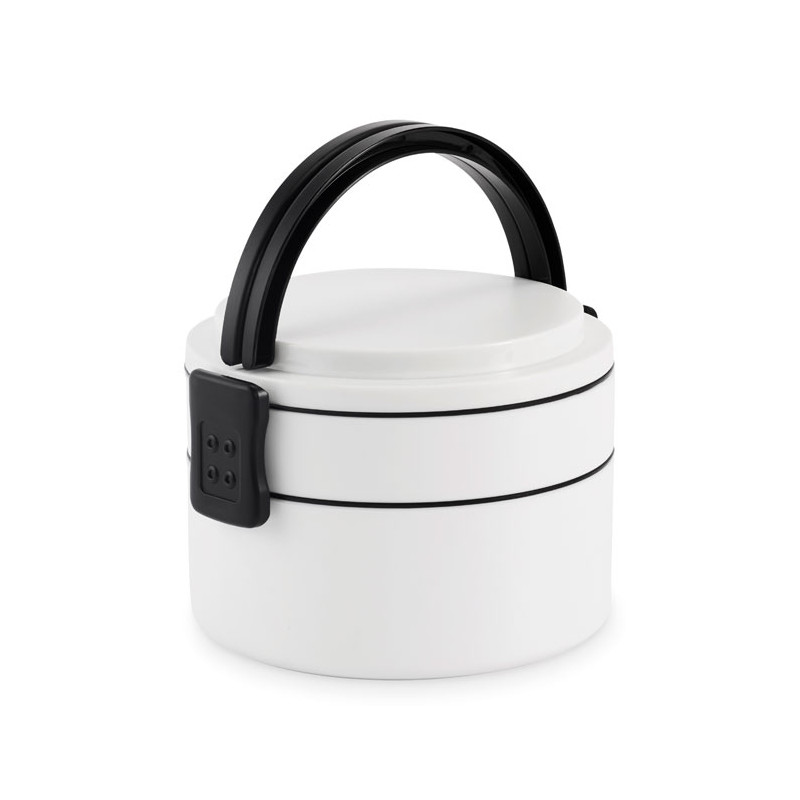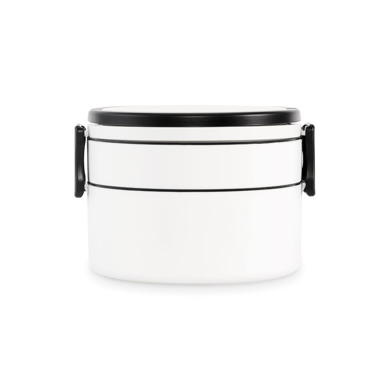 Fiambrera redonda de dos pisos fabricada en PP con cierre de clip lateral y asas. Incluye tapas interiores. Capacidad 250 ml arriba, 700 ml abajo.