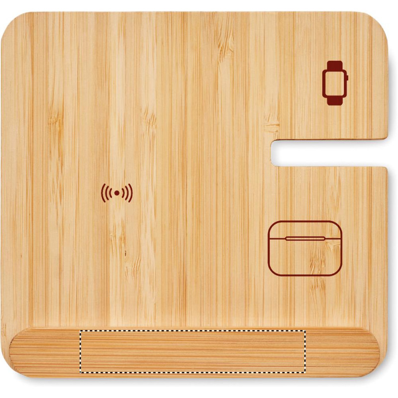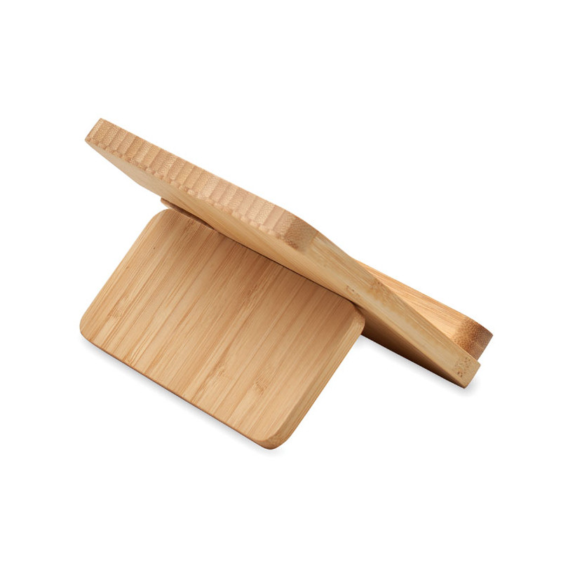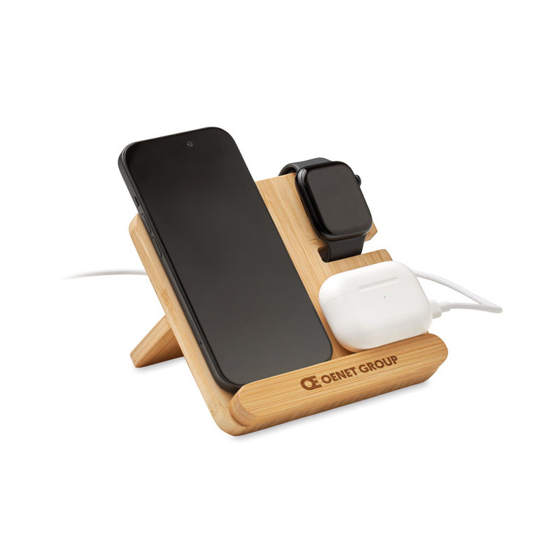 Cargador inalámbrico 3 en 1 en funda de bambú y soporte para teléfono. Incluye un cargador inalámbrico de doble bobina de 15 W, un cargador para smartwatch (solo Apple®) y un cargador TWS.