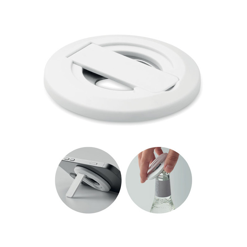Soporte magnético para teléfono con abrebotellas. Compatible con iPhone® 12 y posteriores. Incluye un anillo metálico magnético adicional para cargar otros teléfonos con carga inalámbrica no magnética.