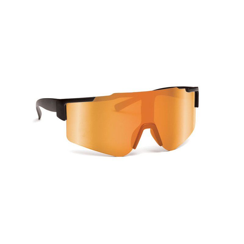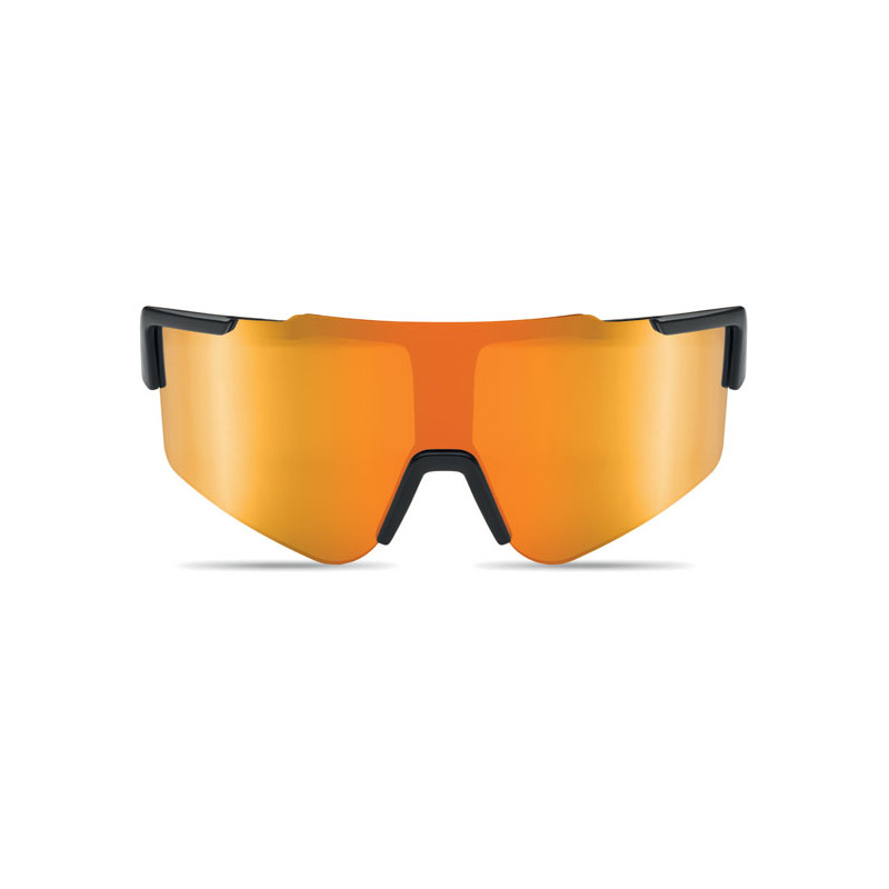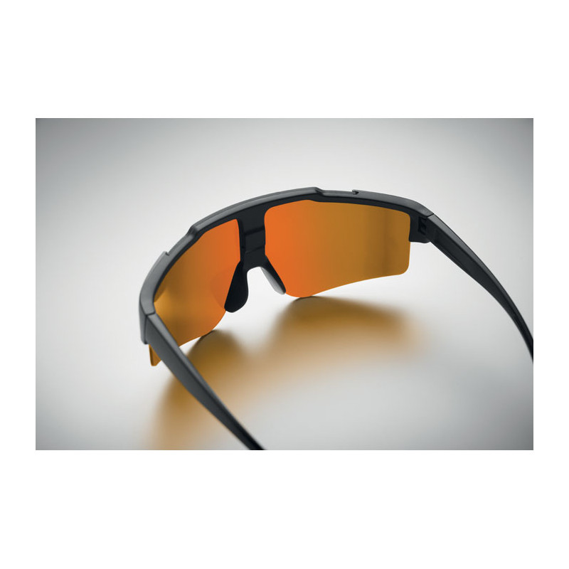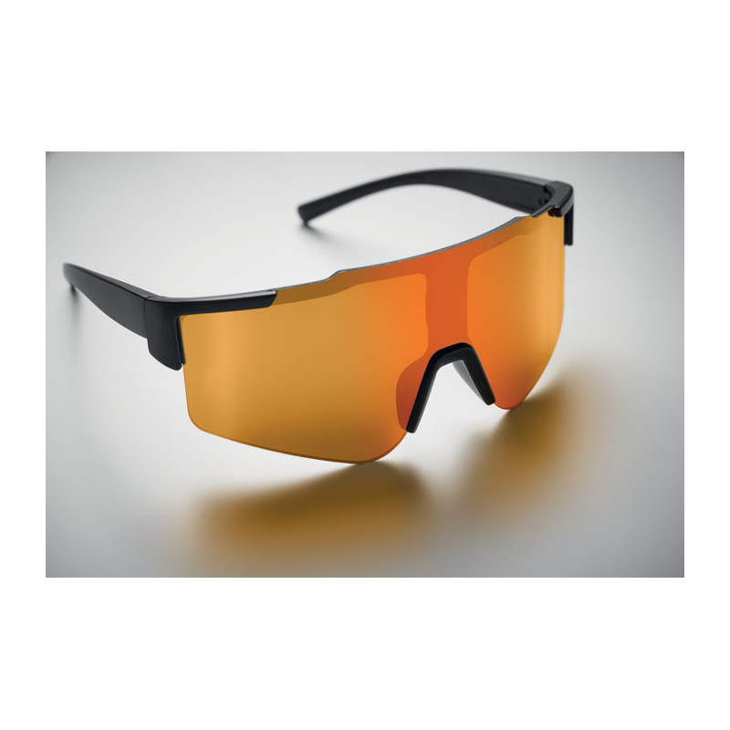 Gafas deportivas con lentes espejadas y montura negra. Un regalo práctico y estilizado, ideal para promocionar su marca.