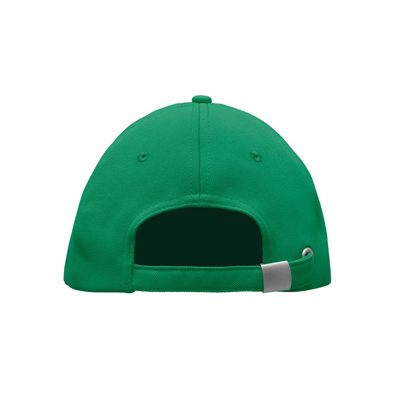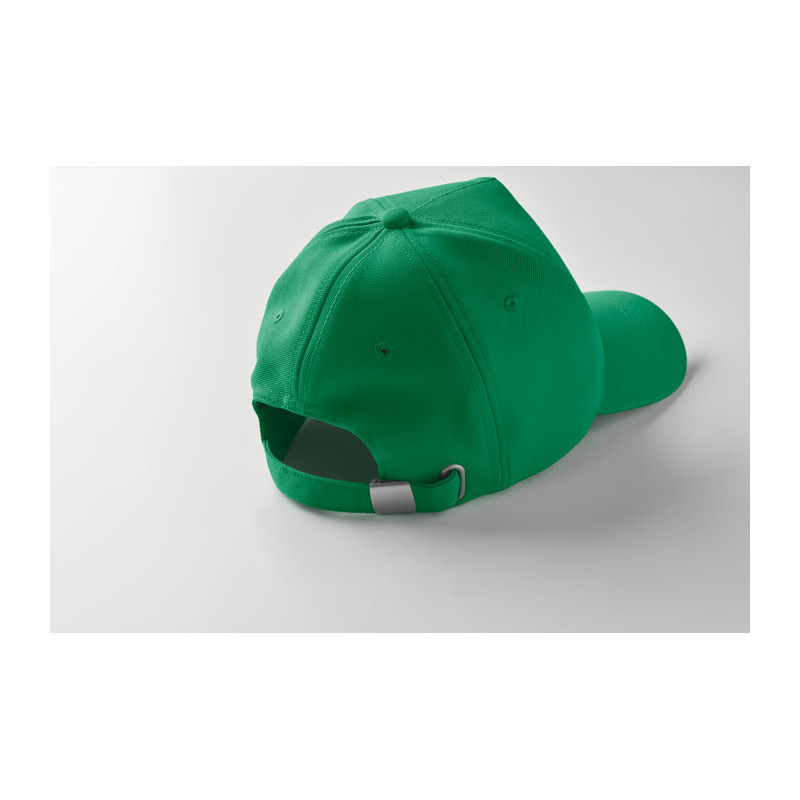 Gorra de béisbol de 5 paneles en poliéster Rpet de 210 gr/m² con hebilla de acero plateada. 4 ojales bordados en color a juego. Talla 7 1/4.
